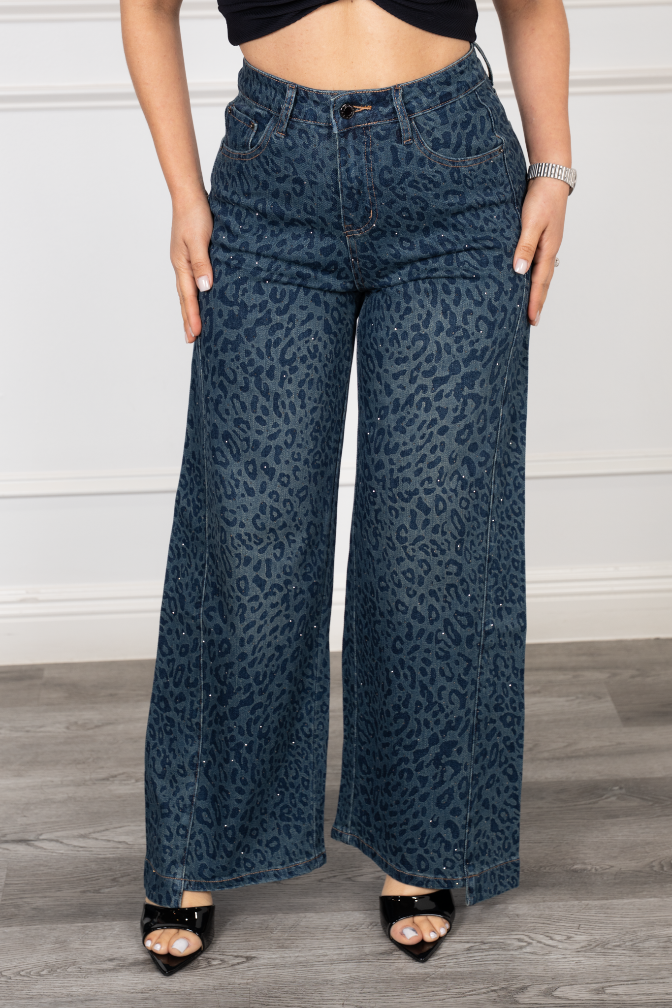 Elegant black jeans with uniform rhinestone details with animal print a wide leg silhouette and classic side and back pockets. Designed with a front button and zipper closure, they combine sophistication and shine in one striking piece.