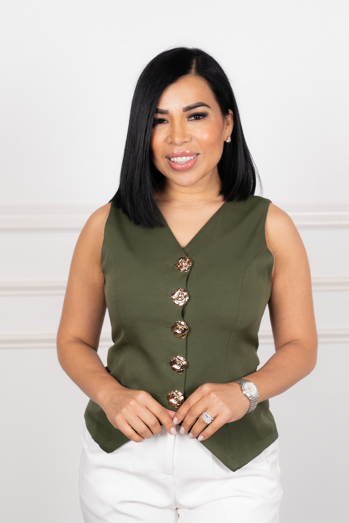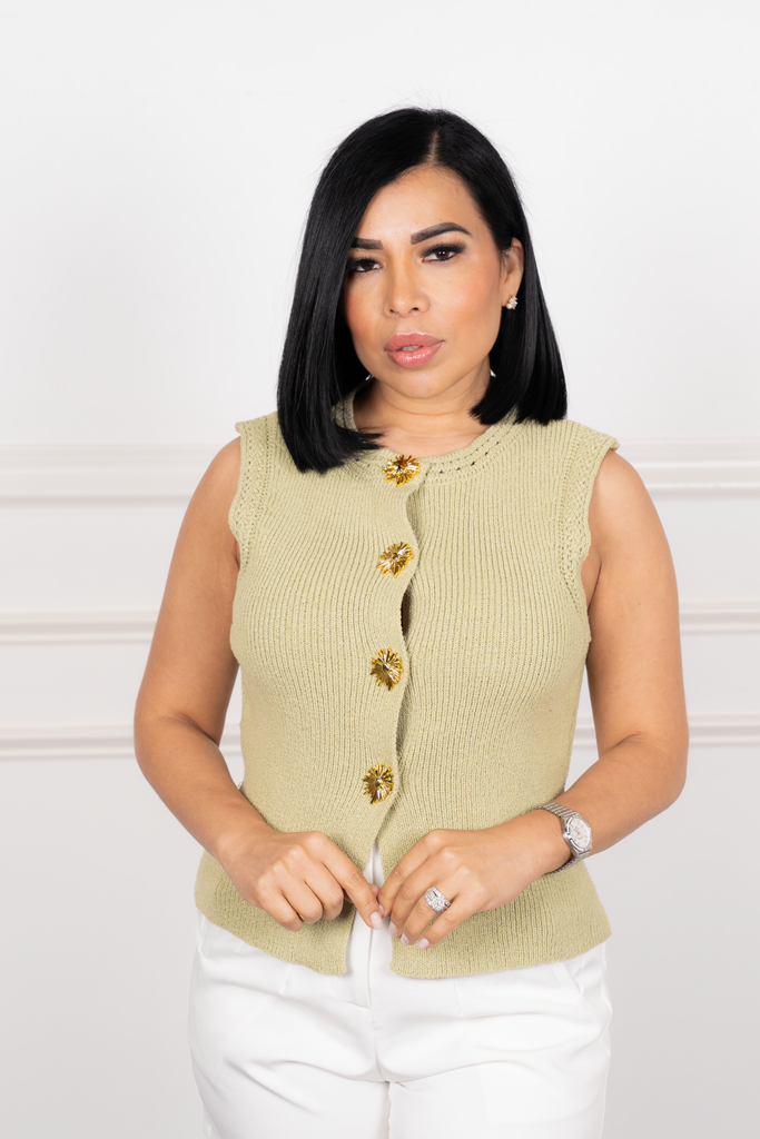 Claudia - Olive Green Sleeveless Knit Button Blouse