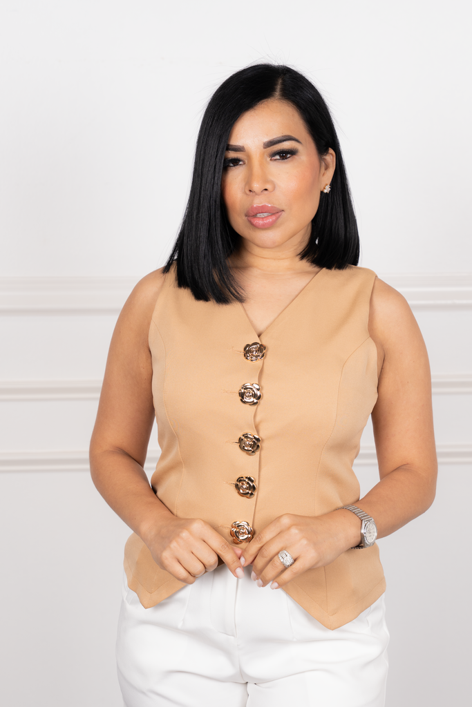 Claudia - Light Brown Sleeveless Knit Button Blouse