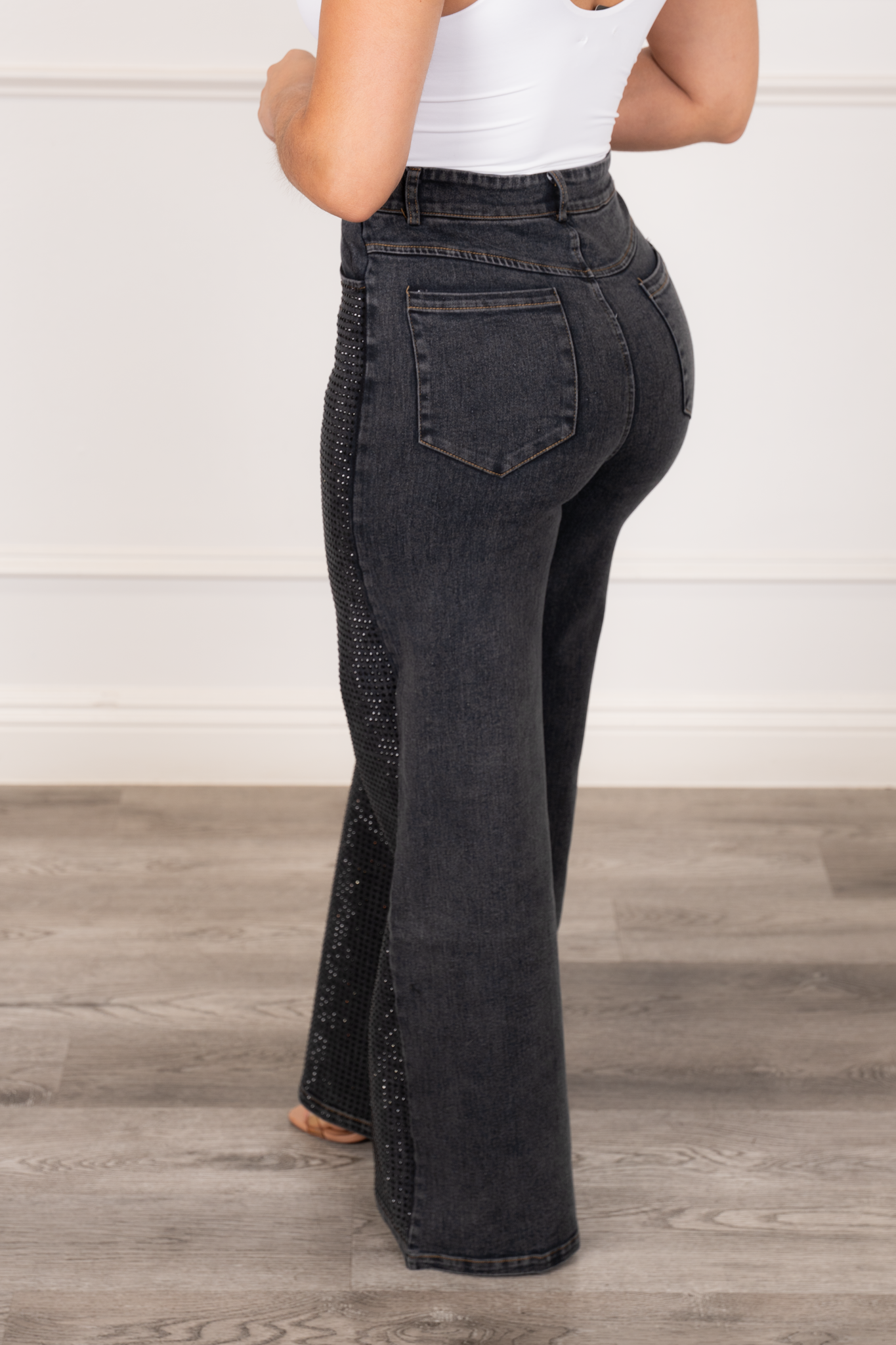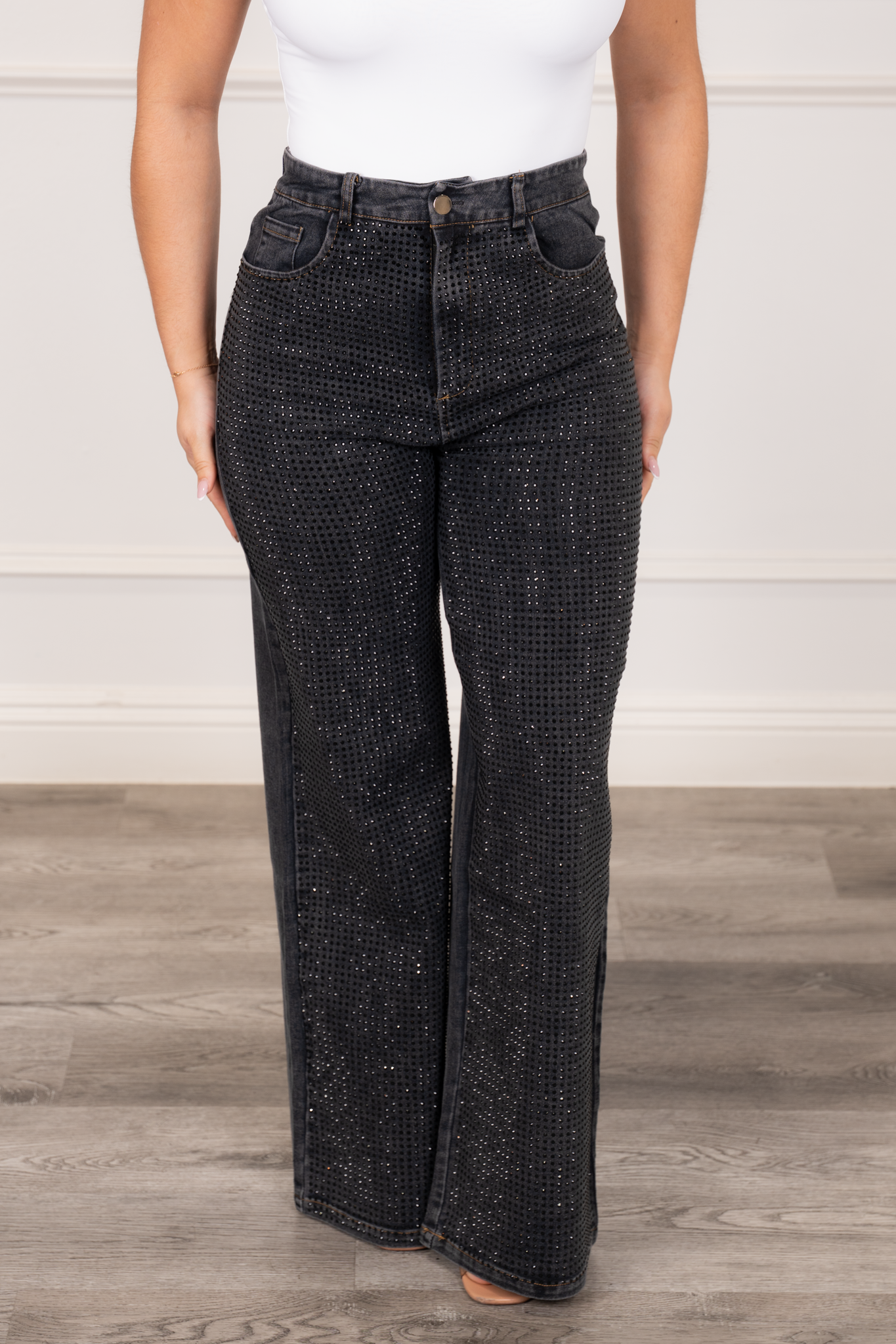 Elegant black denim pants featuring uniform rhinestone details on the front, a wide-leg silhouette, and classic side and back pockets. Designed with a front button and zipper closure, they combine sophistication and sparkle in one statement piece.
