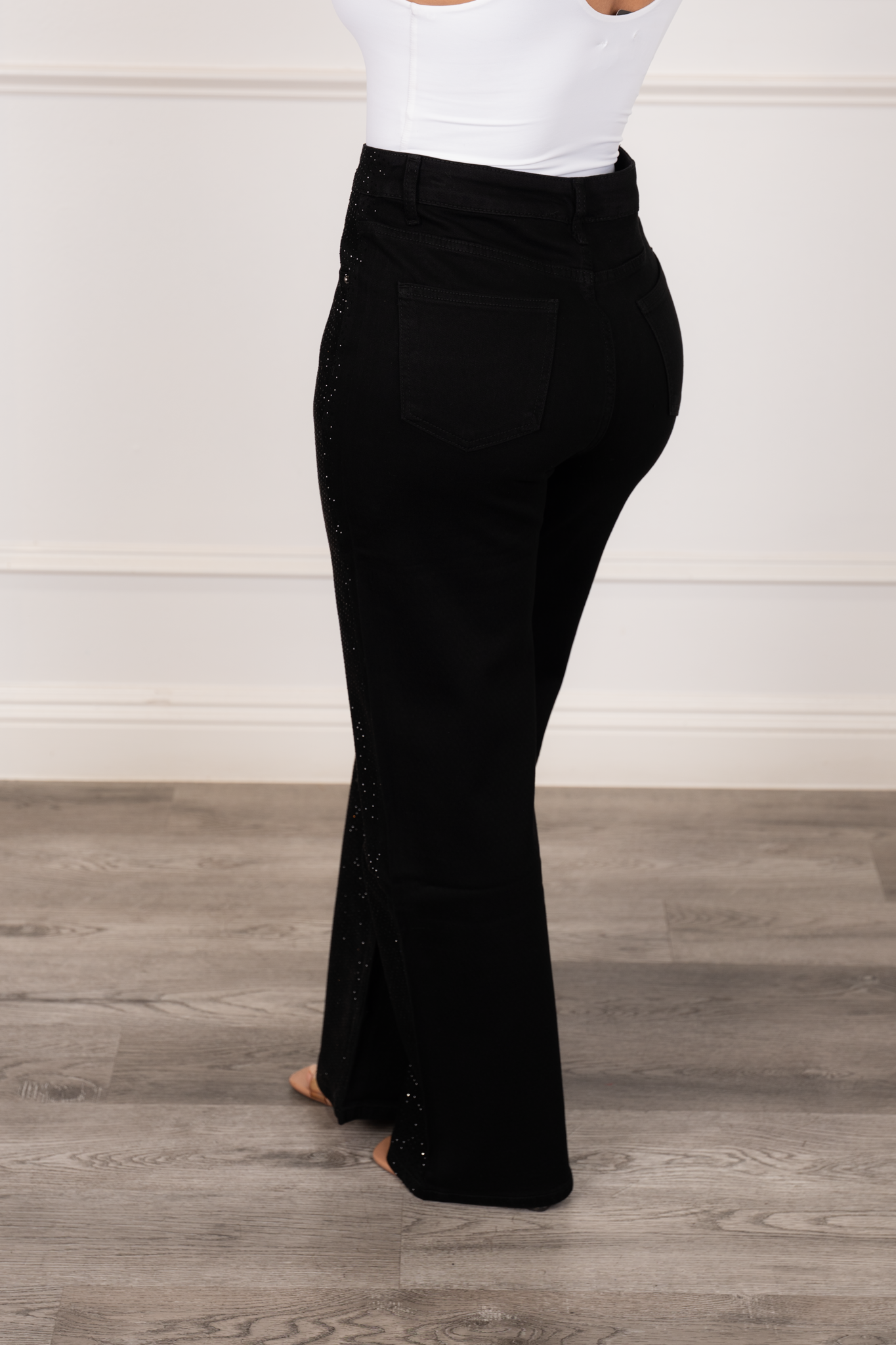 Stylish black denim pants with uniform rhinestone embellishments on the front, wide-leg cut, and side and back pockets. Designed with stretch fabric and a front button and zipper closure, they combine comfort, shine, and modern elegance.