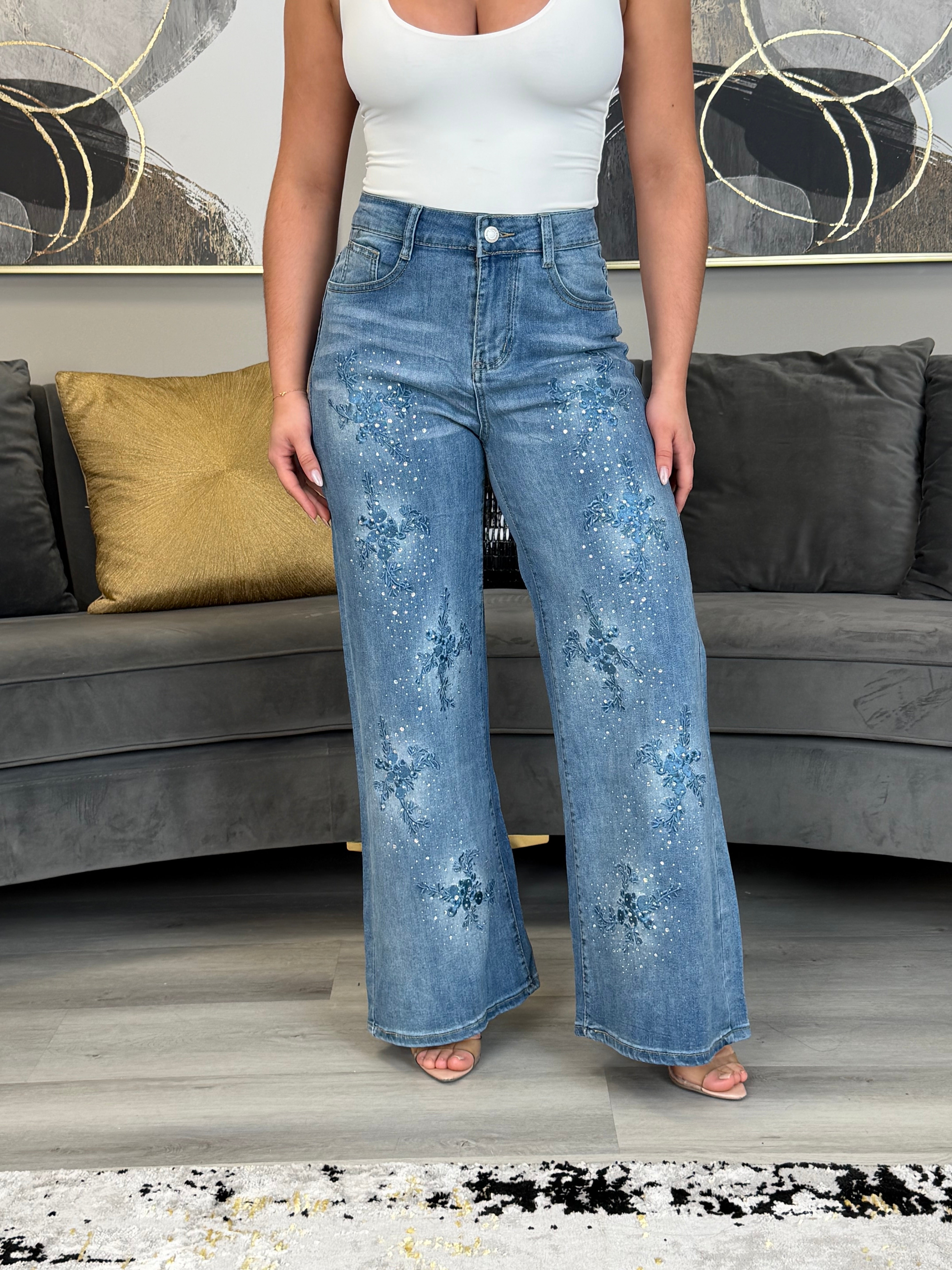 Light Denim Pants with Rhinestone & Flowers – Elegant & Chic