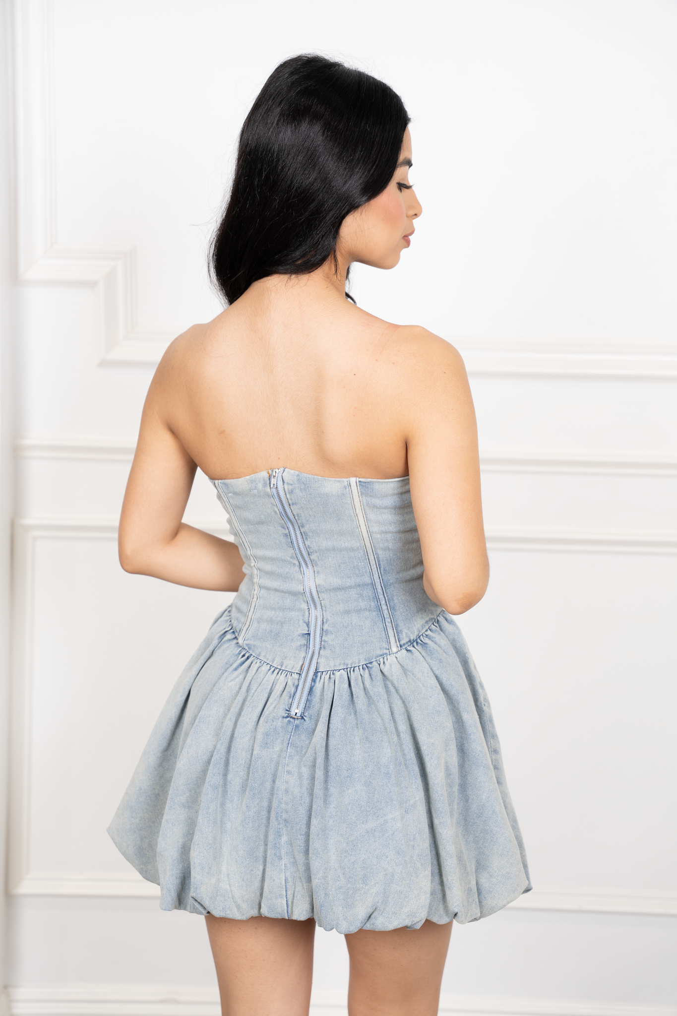 Strapless Denim Bubble Mini Dress – Chic & Playful