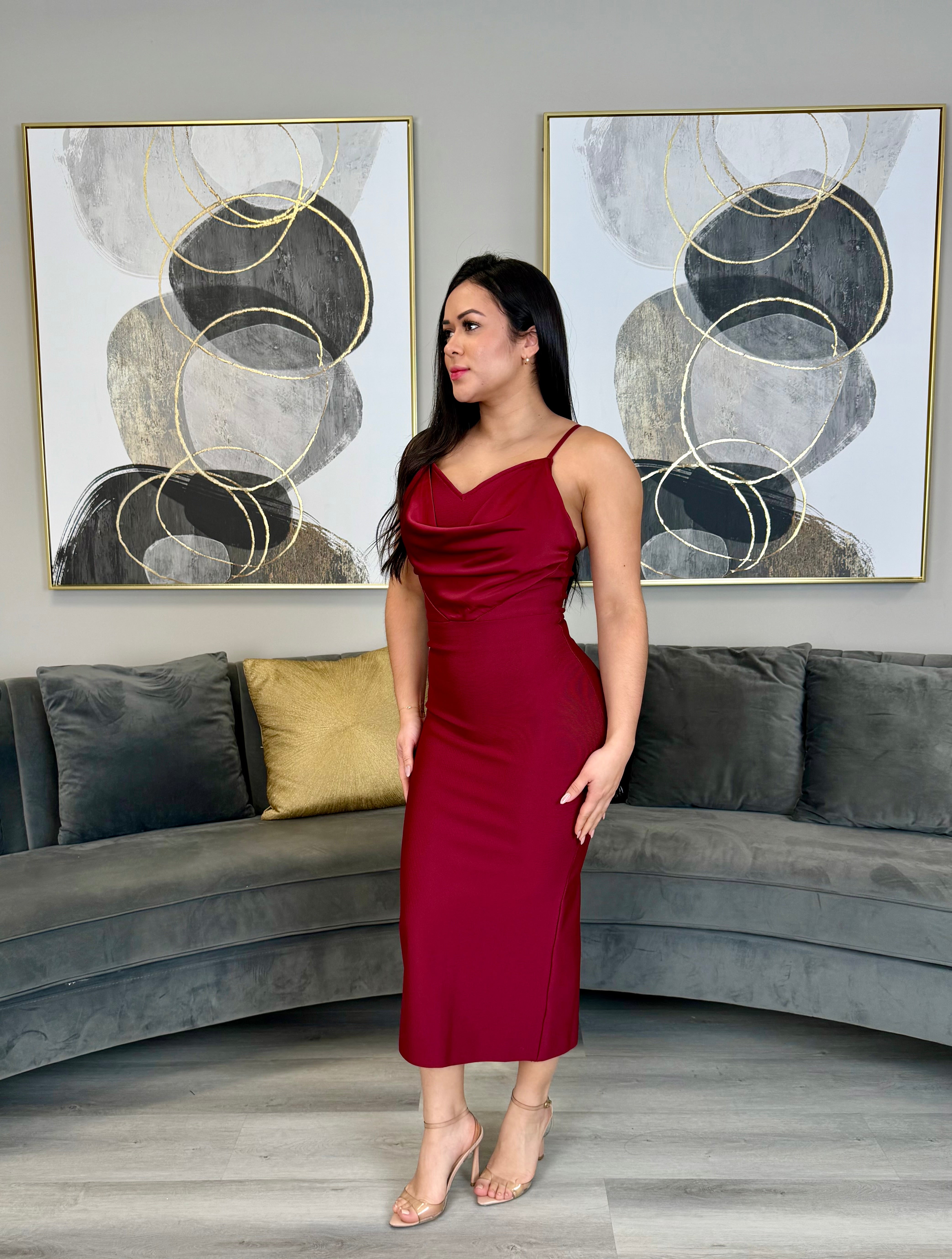 The midi dress embodies pure sophistication with a touch of glamour. Designed with straps and a semi-heart neckline, it is adorned with delicate gathered fabric. Its bandage fabric embraces the body in a pencil-cut silhouette, while the back opening ensures an elegant movement. Perfect for galas, formal events or any occasion where timeless elegance is essential.