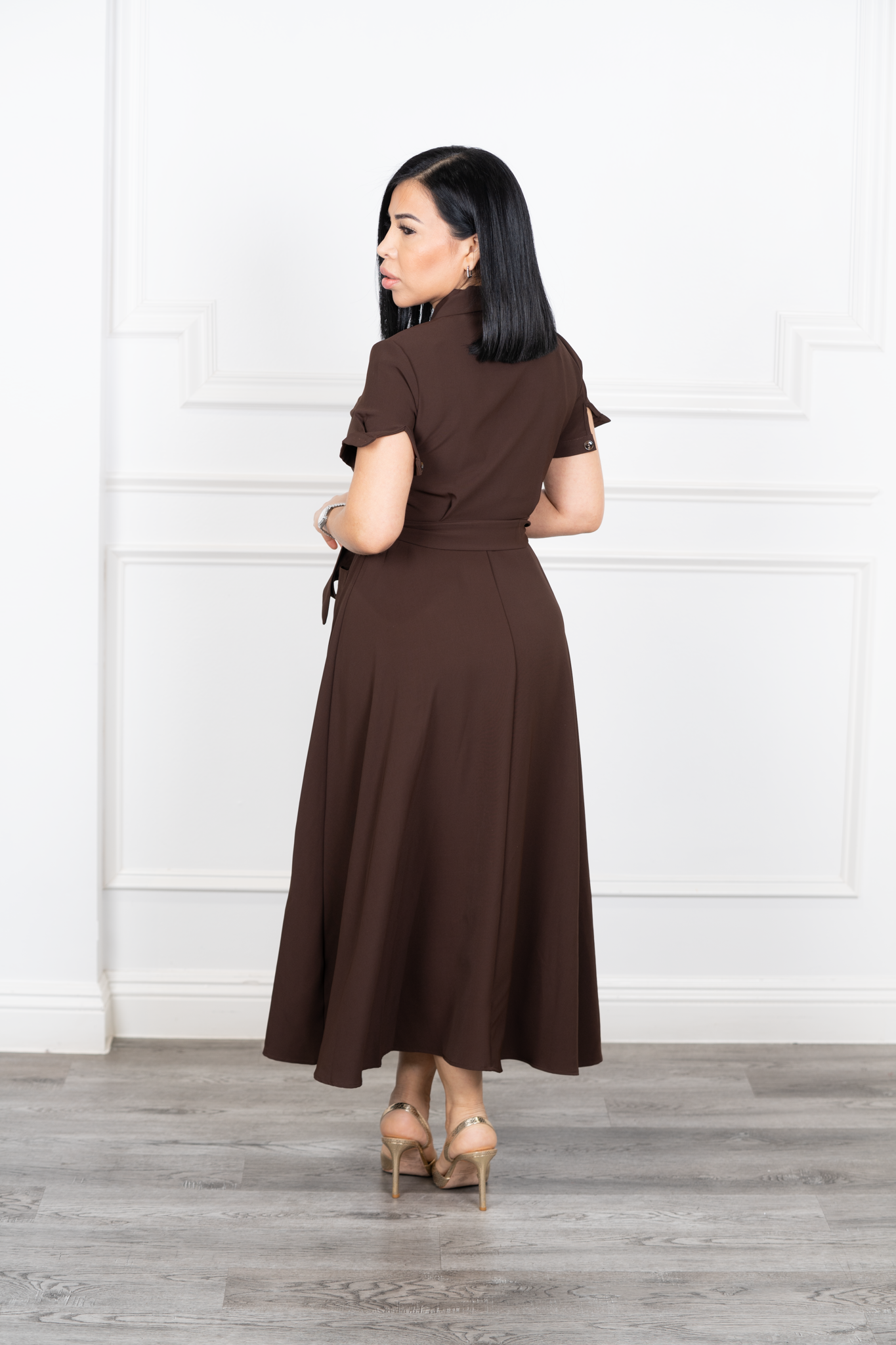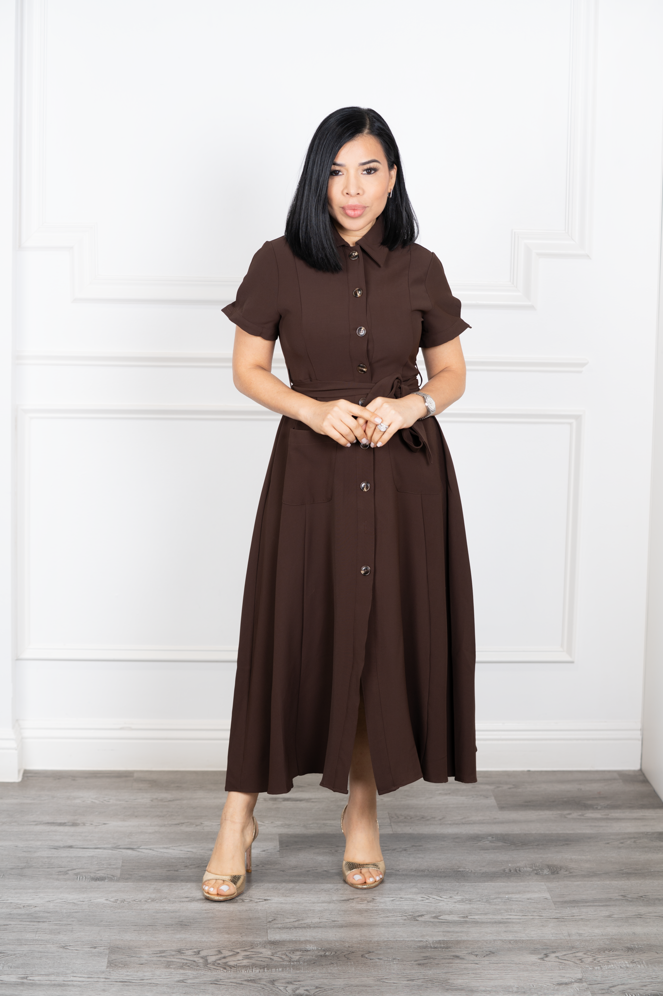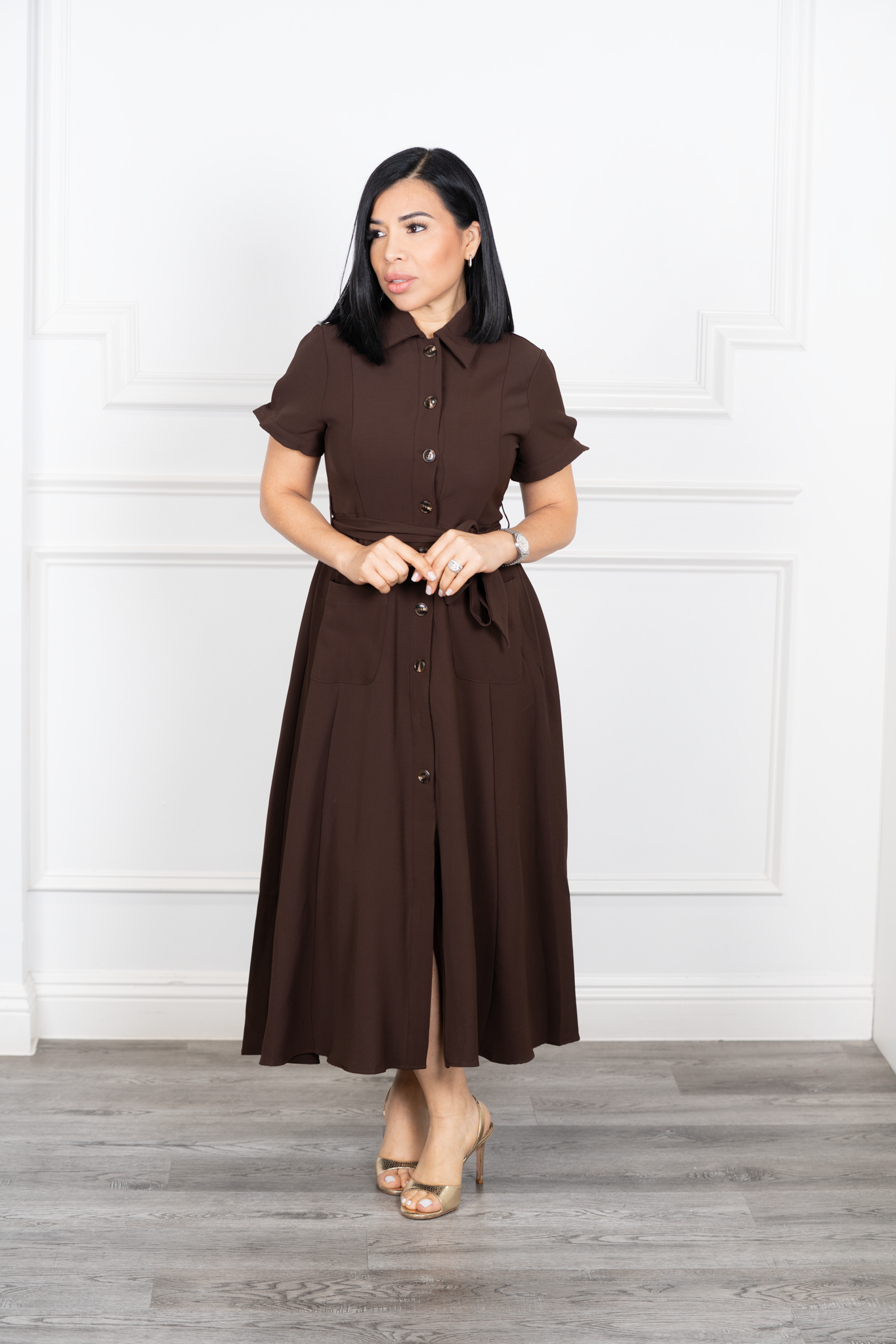 Cleo-Brown Belted Maxi Shirt Dress