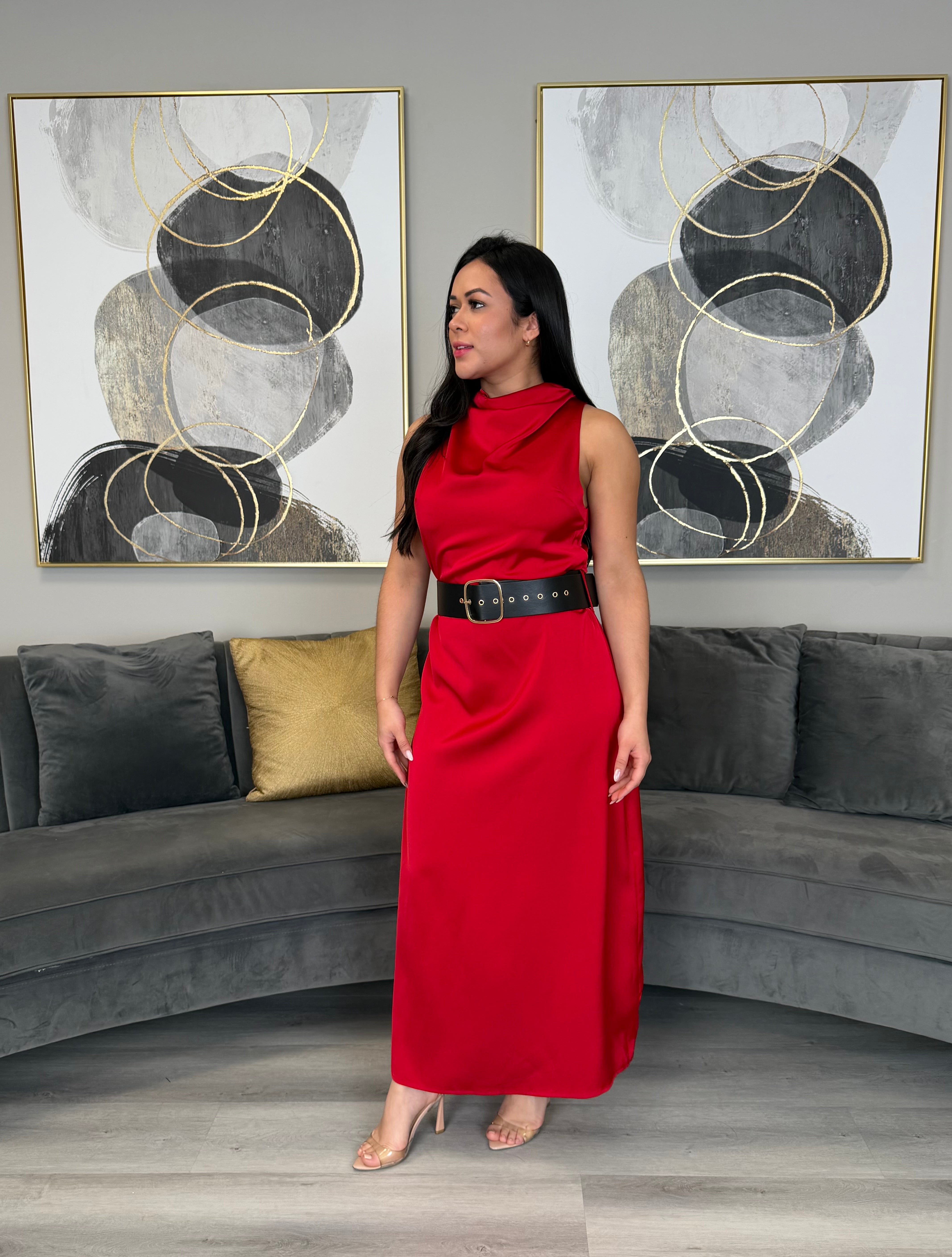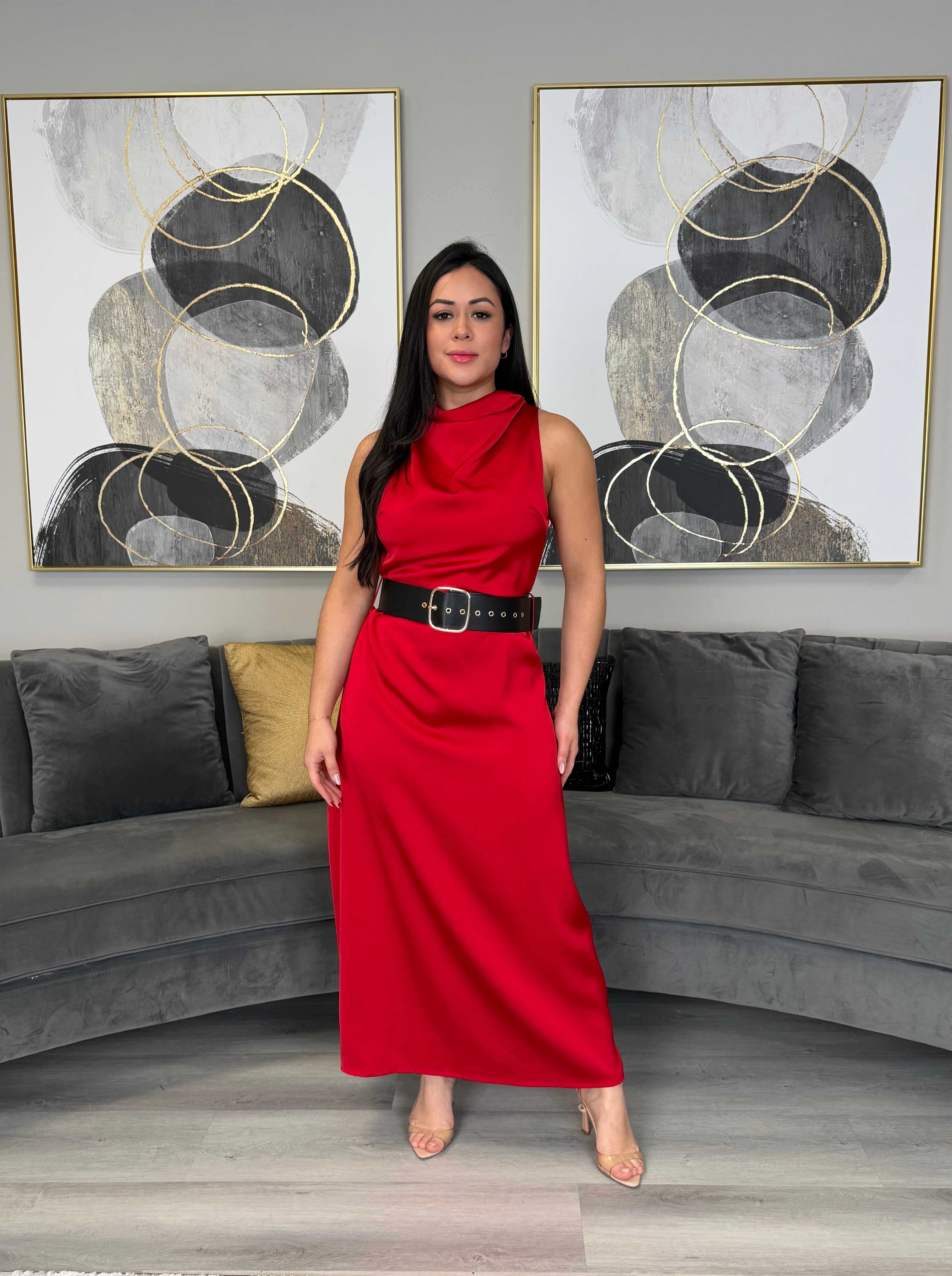 Refined sleeveless satin midi dress featuring a high draped neckline with button closure at the back and a soft side slit. Includes a wide matching belt to accentuate the waist, offering elegance with fluid movement and shine.