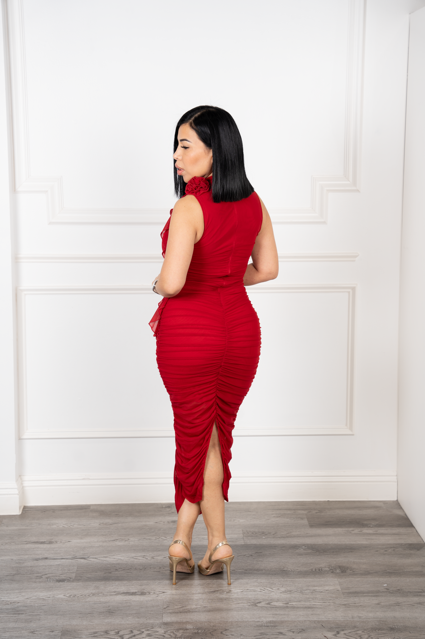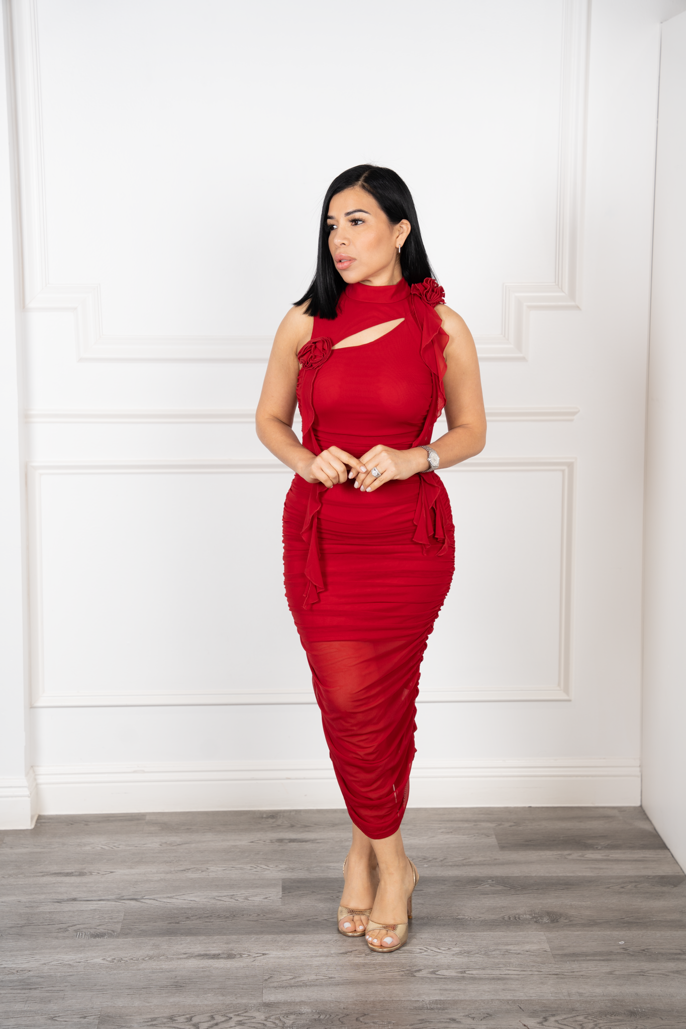 A daring midi dress with a turtleneck and a pencil cut on the gathered sides that enhances the silhouette designed with 3D flowers and loose bows. With a mesh fabric cover, without a zipper, it is a bold but elegant option for exceptional occasions.