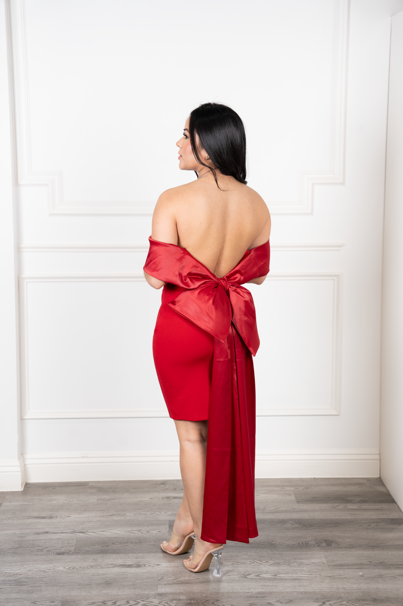 This eye-catching mini dress features a strapless neckline with a single off-shoulder strap detail for a modern, asymmetrical twist. The body-hugging silhouette highlights your curves, while a dramatic oversized bow at the lower back adds a statement touch, with flowing ties that cascade beautifully. Crafted from stretchy, high-quality fabric and finished with a discreet side zipper for a sleek fit.