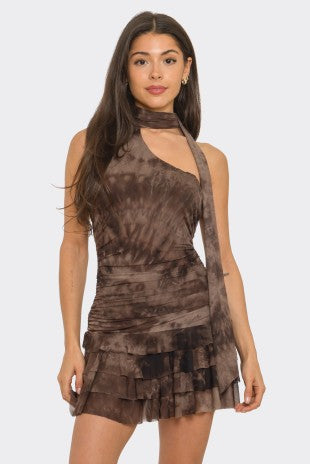 Mini Dress – High Neck with Ruched Sides, Asymmetrical Ruffles & Side Ties