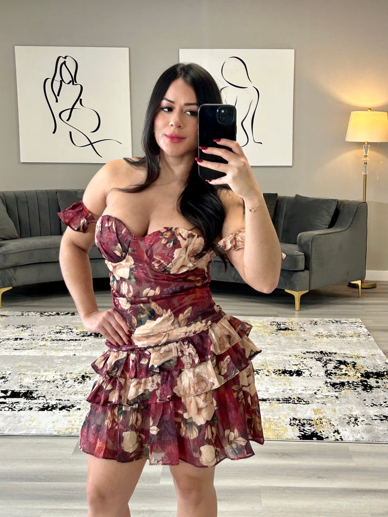 An elegant strapless mini dress with a corset-style bodice with floral details on every garment structured with pads for support. The layered ruffled skirt adds movement and charm, creating a romantic yet confident silhouette perfect for any occasion.