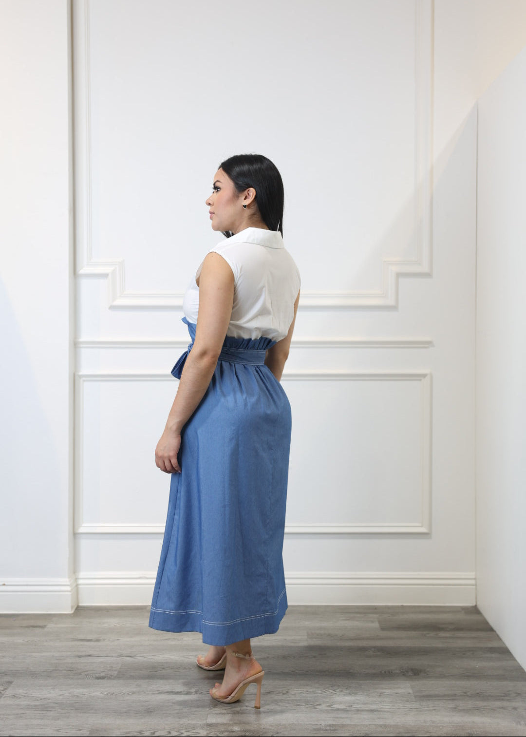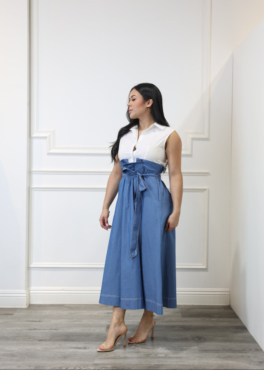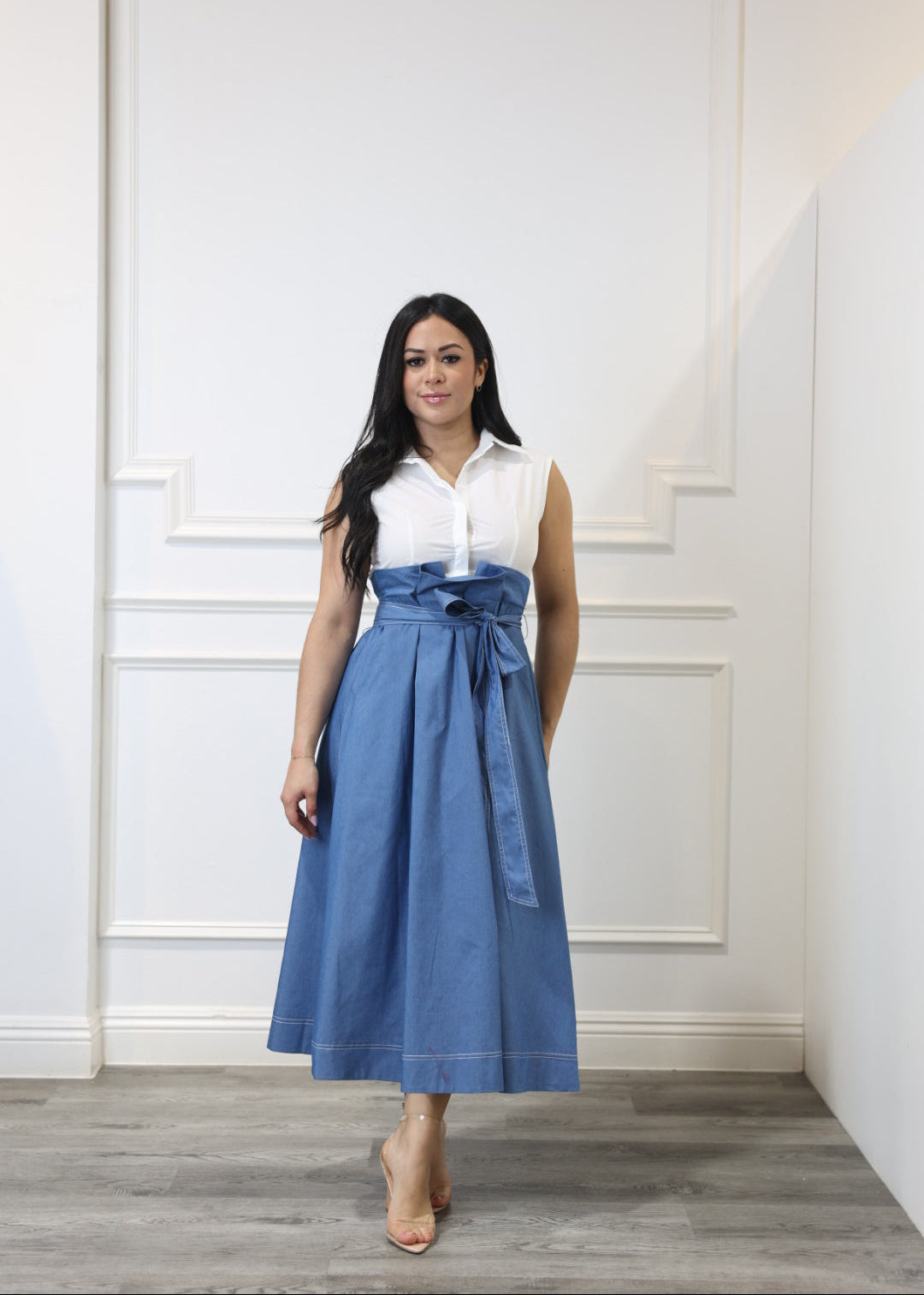 This sleeveless midi blends classic and cool with a polo-style top, front buttons, and a flowy pleated skirt in a contrasting tone. Designed to look like a two-piece, it features a cinching waist tie and elastic at the back for extra comfort. Full of volume, personality, and charm.