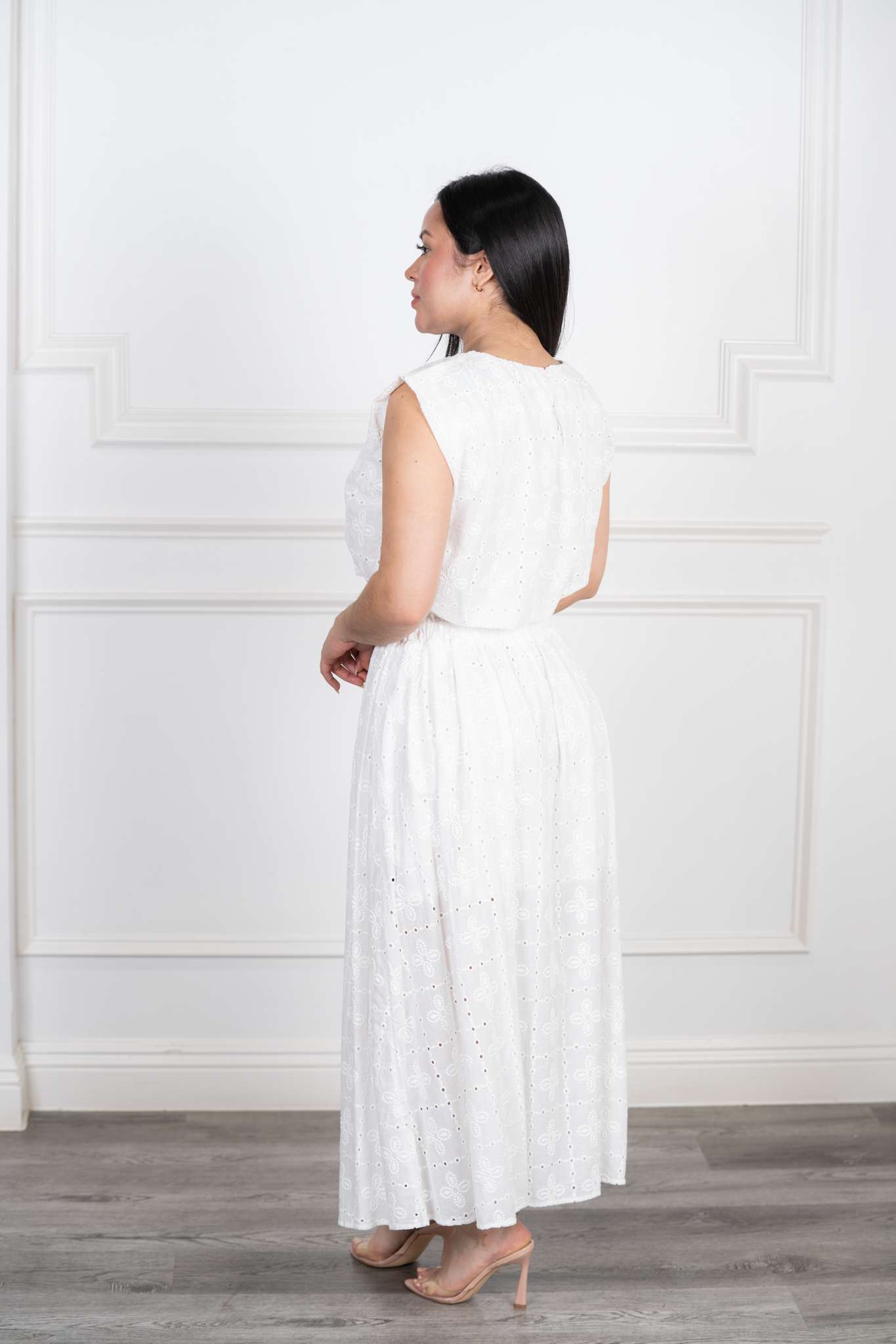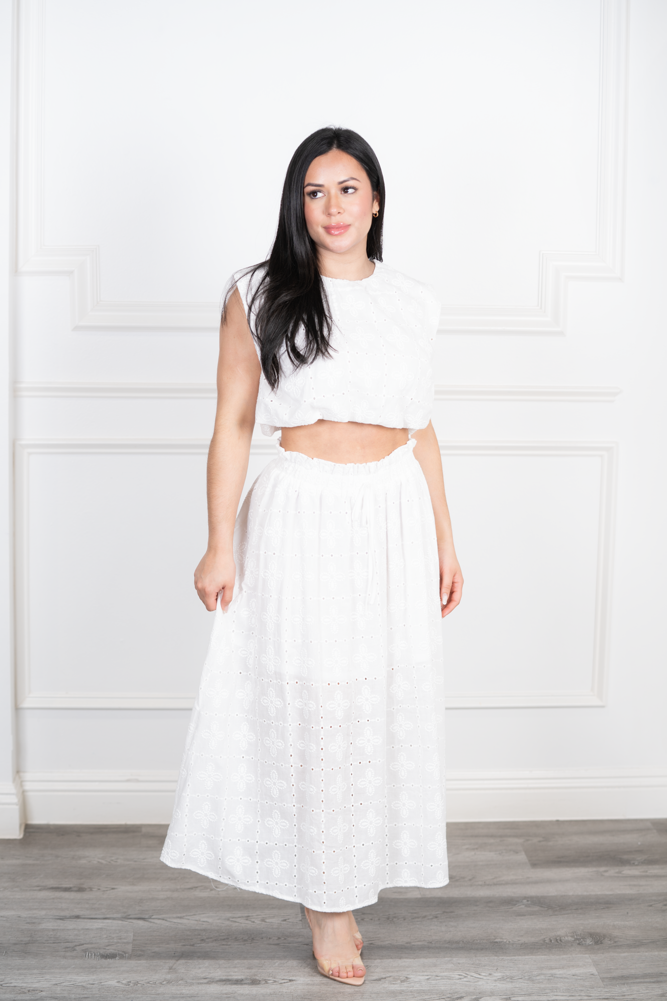 This beautiful two-piece set features a flowy, oversized square-neck top with dropped sleeves, elastic at the waist, and neck buttons for a secure fit. The matching long skirt includes an elastic waistband for added comfort. Both pieces are crafted with delicate embroidered fabric and fully lined for a polished look.
