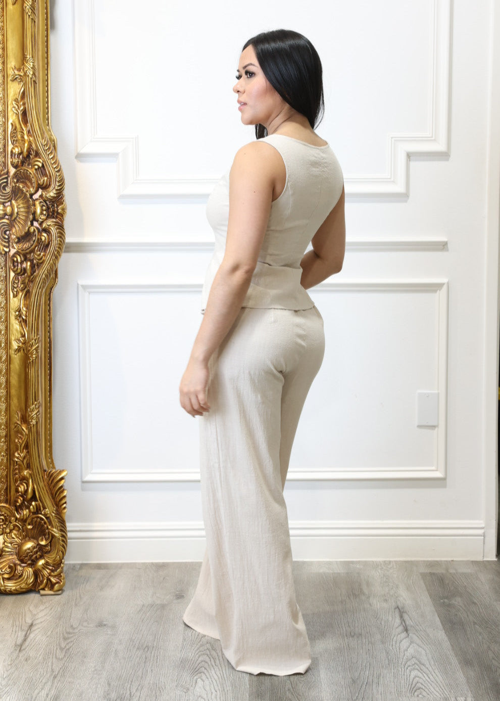 The sleeveless top features wide straps, a round neckline, and front buttons for a clean, minimal look. Paired with wide-leg trousers that offer a tailored fit with a front zipper and button closure, plus convenient side pockets for everyday ease.