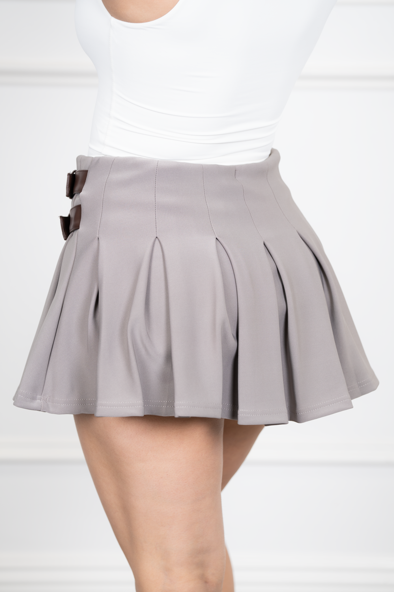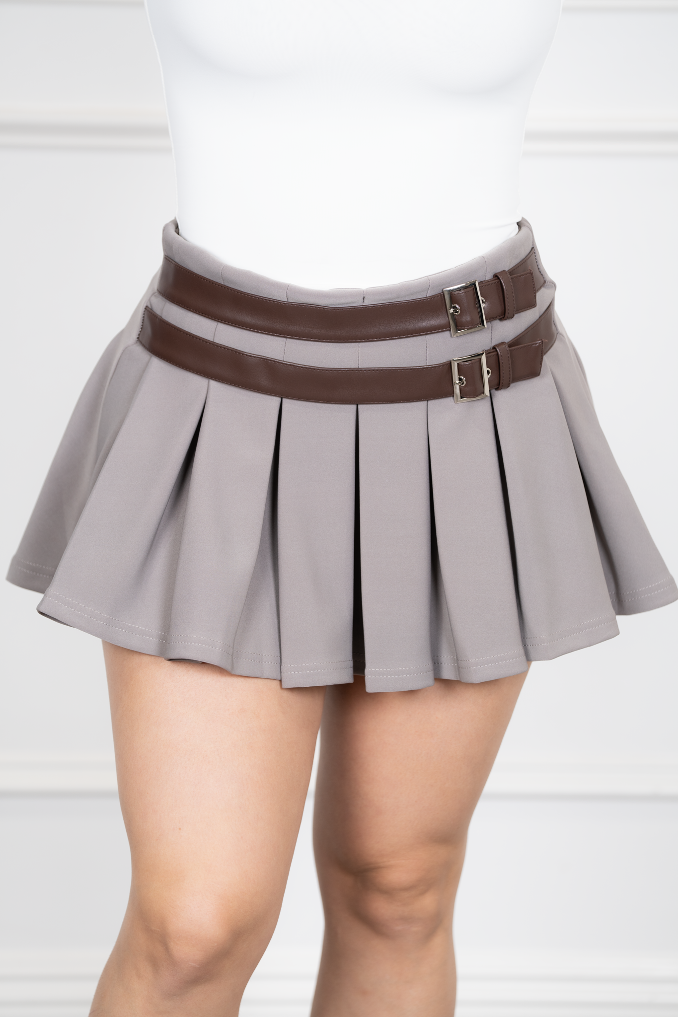 Amora-Grey Scuba Pleated Mini Skirt With Dual Faux Leather Bett