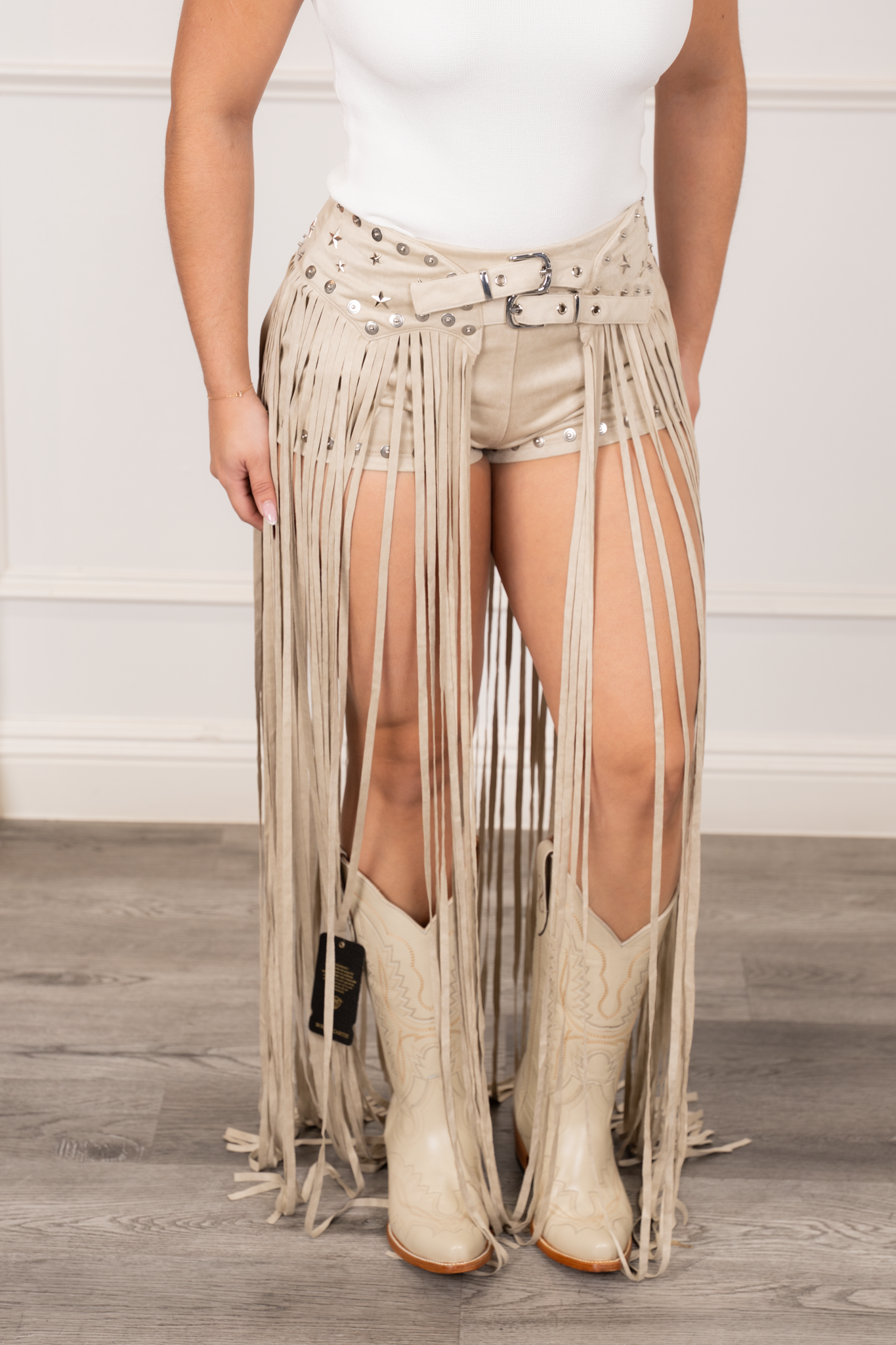 Mini Shorts – Velvet Design with Fringe Belt Overlay & Side Pockets