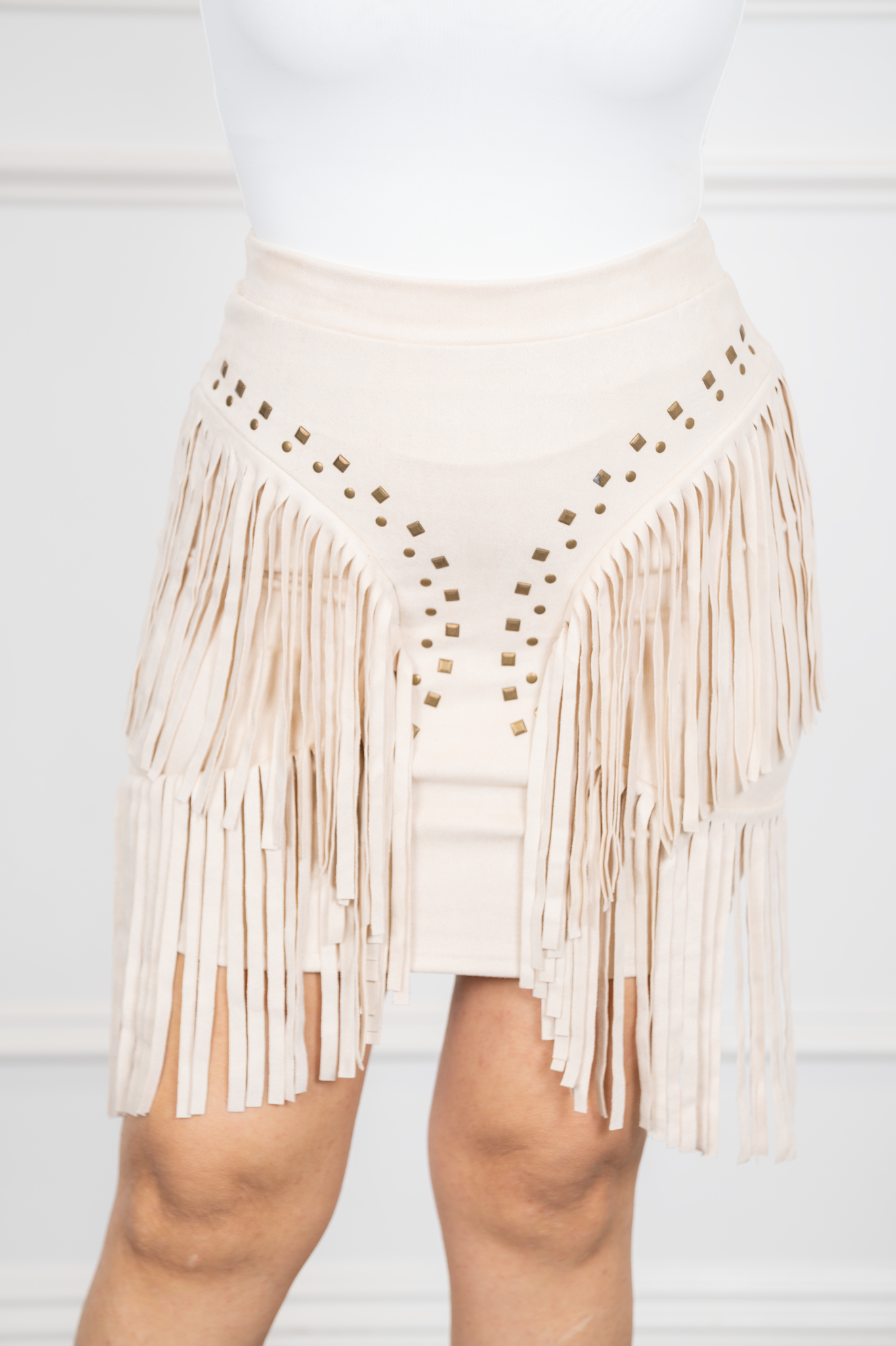 Moxa-Camel STUD EMBELLISHED LAYERED FRINGE SIDE DETAIL MINI SKIRT