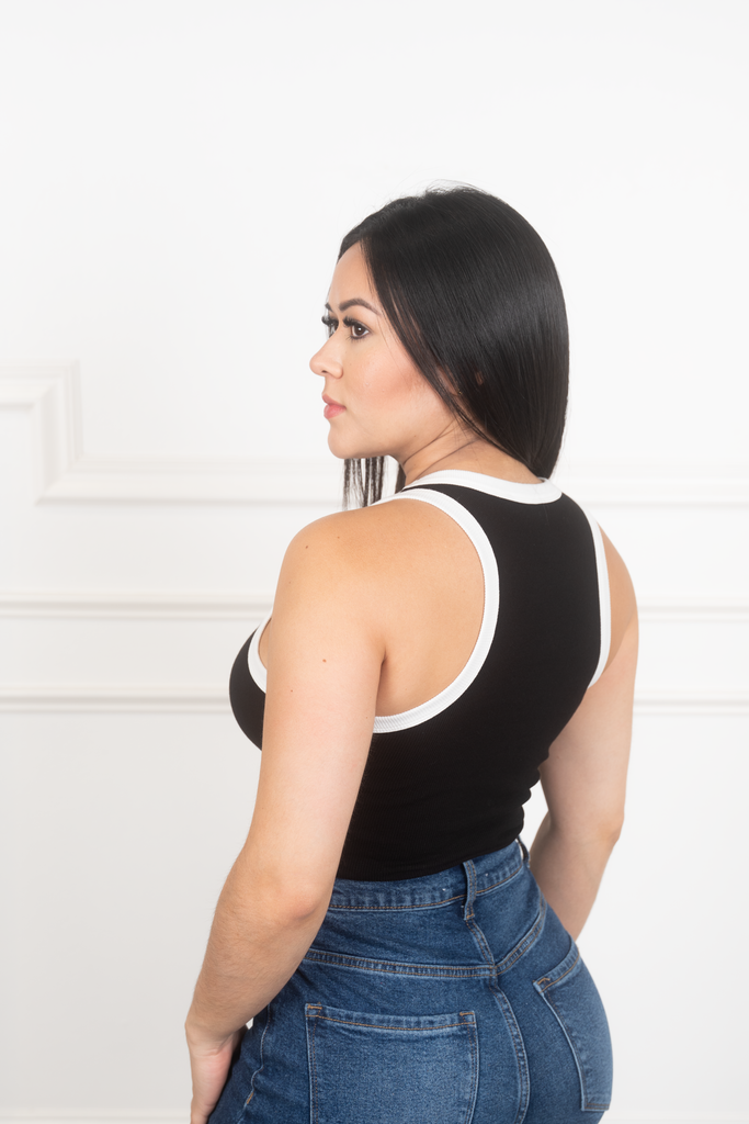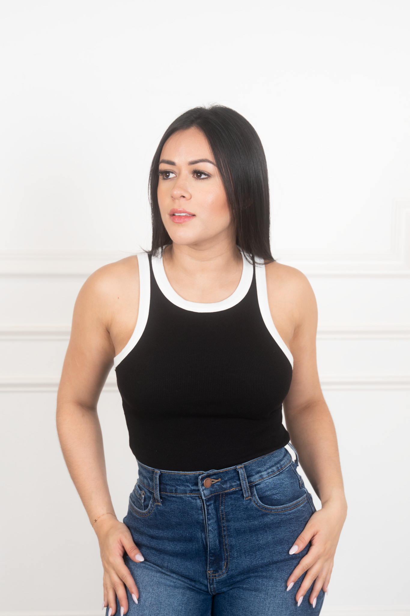 A fitted tank top with a sporty vibe, featuring contrast-colored trim along the neckline and armholes. Crafted with soft stretch cotton for a flattering, body-hugging fit that’s perfect for layering or wearing solo on casual days.