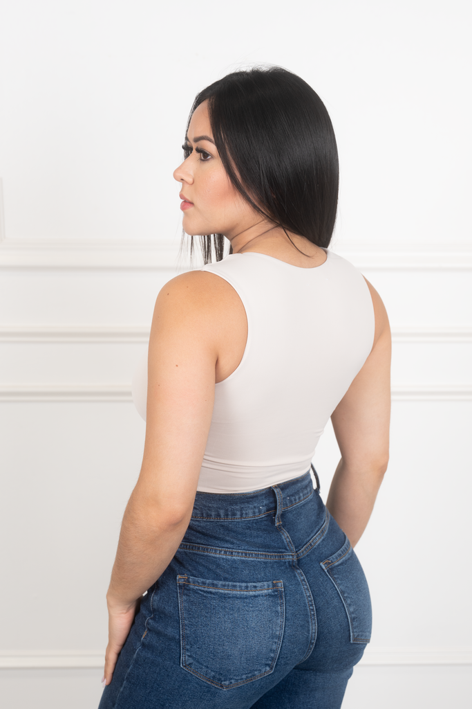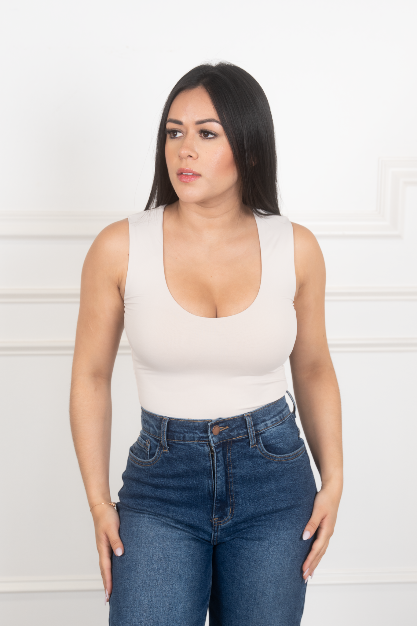 A versatile tank top with a rounded neckline and wide shoulder straps for comfort and coverage. Crafted with double lining and stretchy fabric, it's perfect for layering or wearing solo.