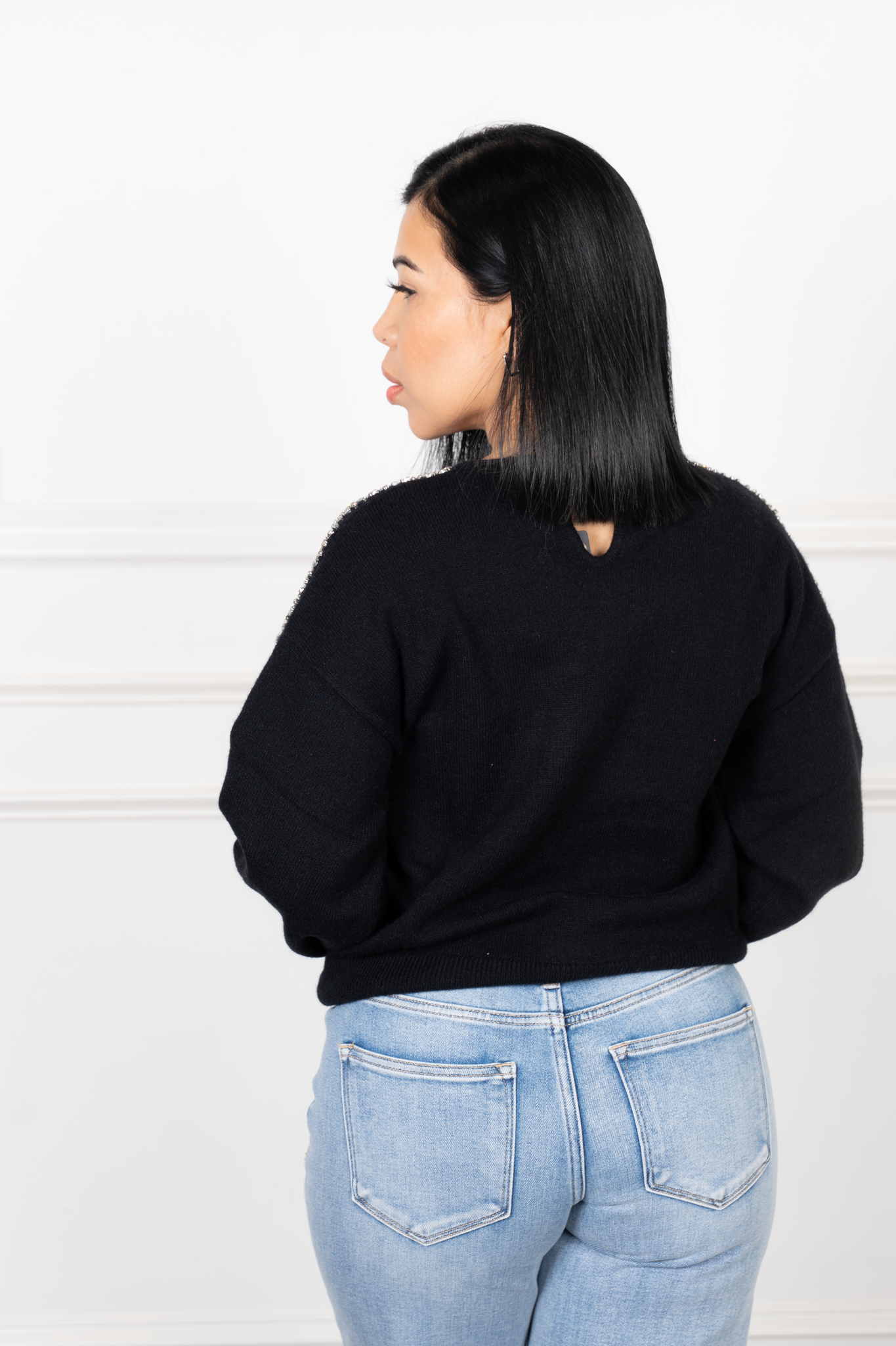 A short sweater that combines elegance and style. With shoulder part rhinestone embroidery, a soft and cozy texture and a round neckline, this piece adds a fun touch to your everyday looks. Its shorter torso cut makes it perfect to combine with high-waisted jeans, skirts or layered sets.