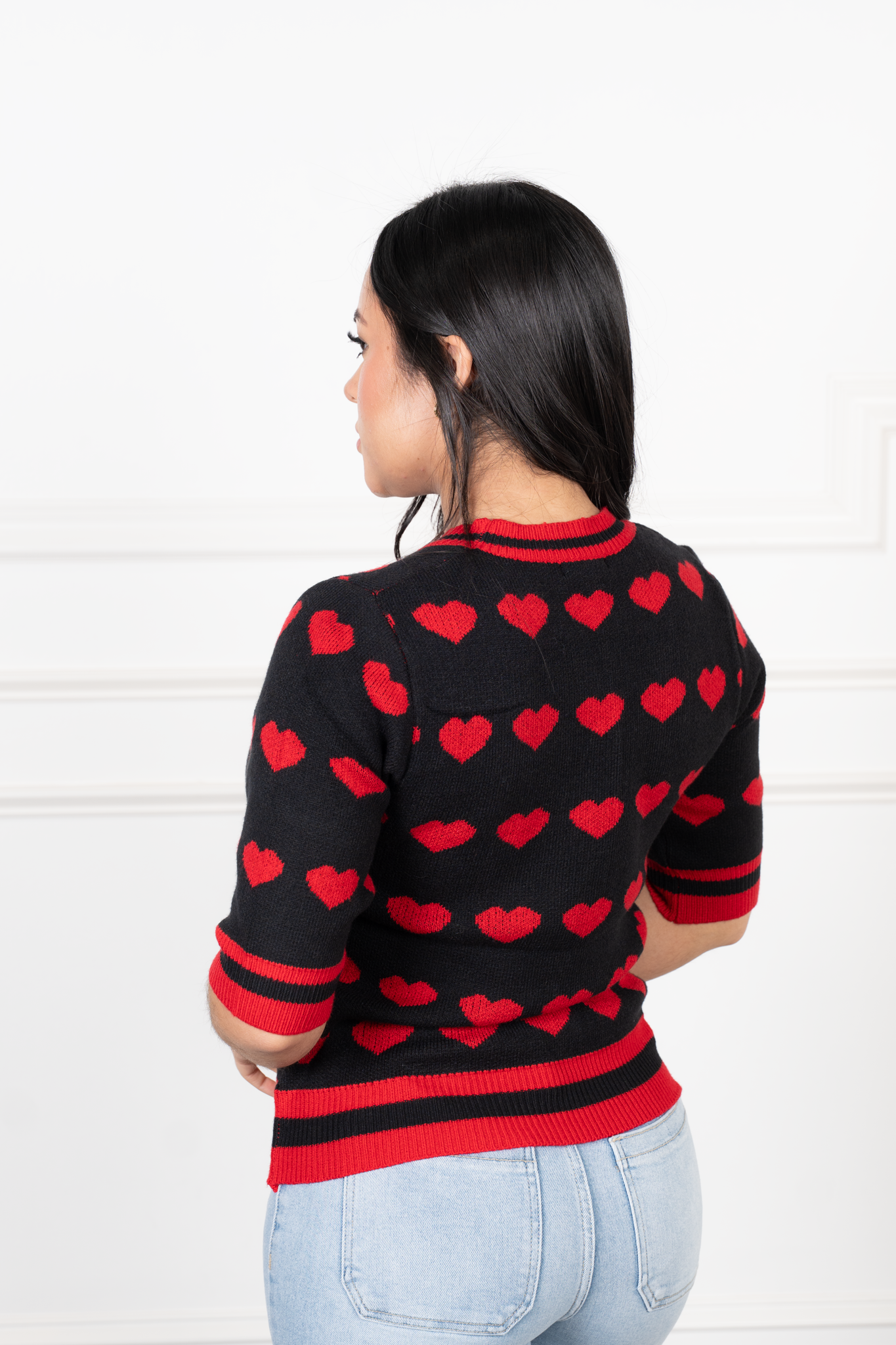 A short knit top that combines love and style. With a print of hearts all over the garment with a soft and cozy texture and a round neckline with short sleeves, this piece adds a fun touch to your everyday looks. Its shorter torso cut makes it perfect to combine with high-waisted jeans, skirts or layered sets.
