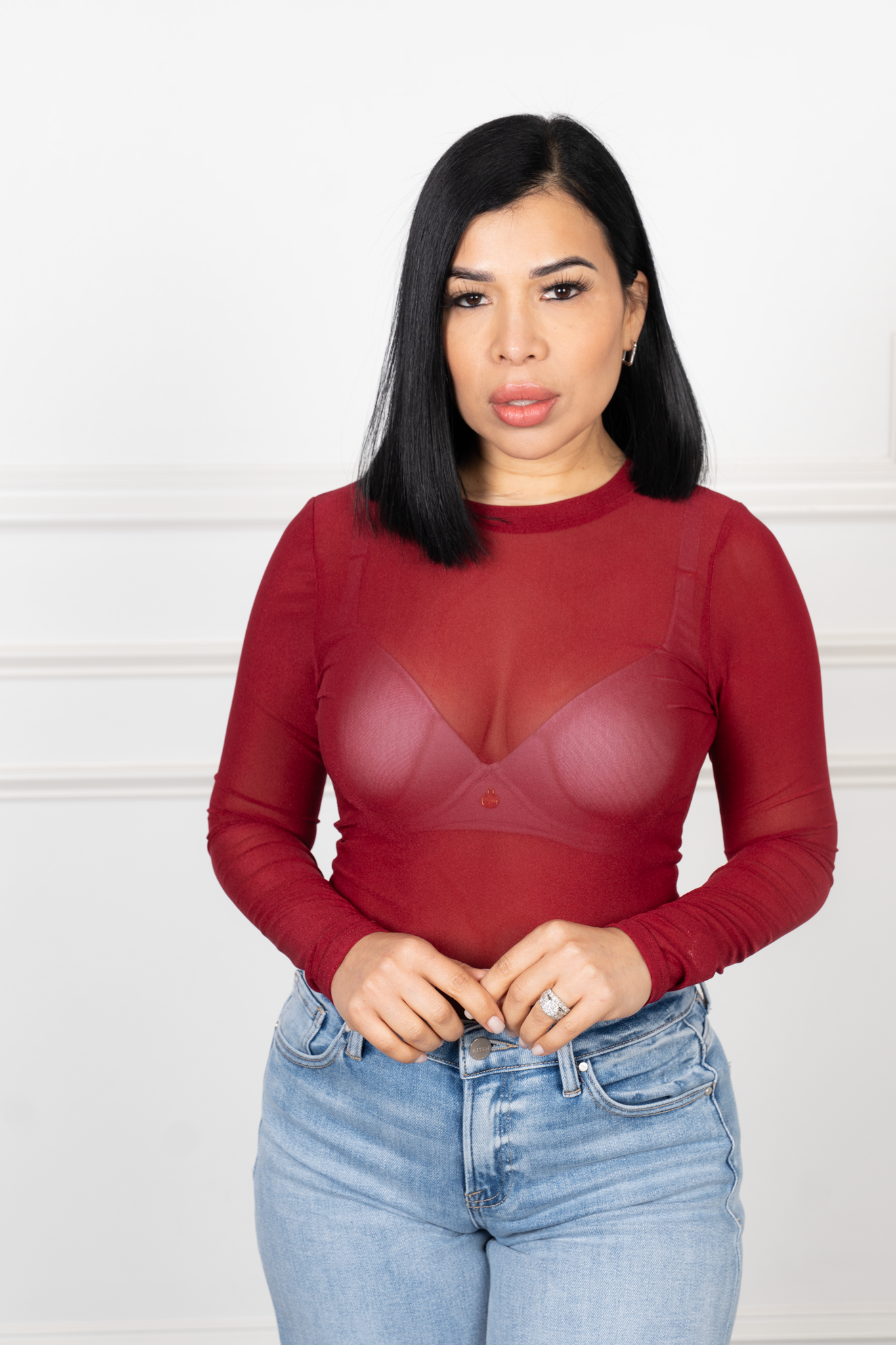 This stunning top combines stretch comfort with see-through allure. Designed with long sleeves and a fitted cut, it’s perfect for layering or making a sleek statement on its own. True to size with a lightweight, breathable feel.