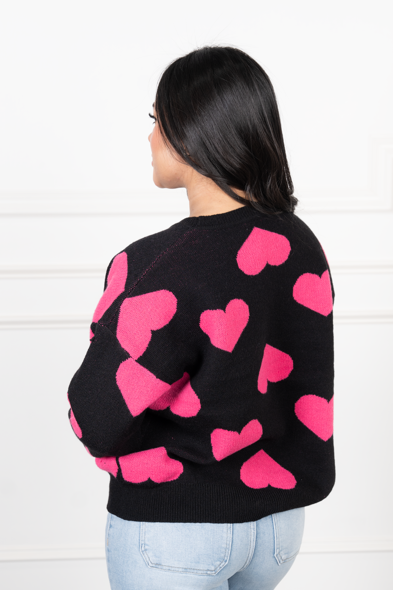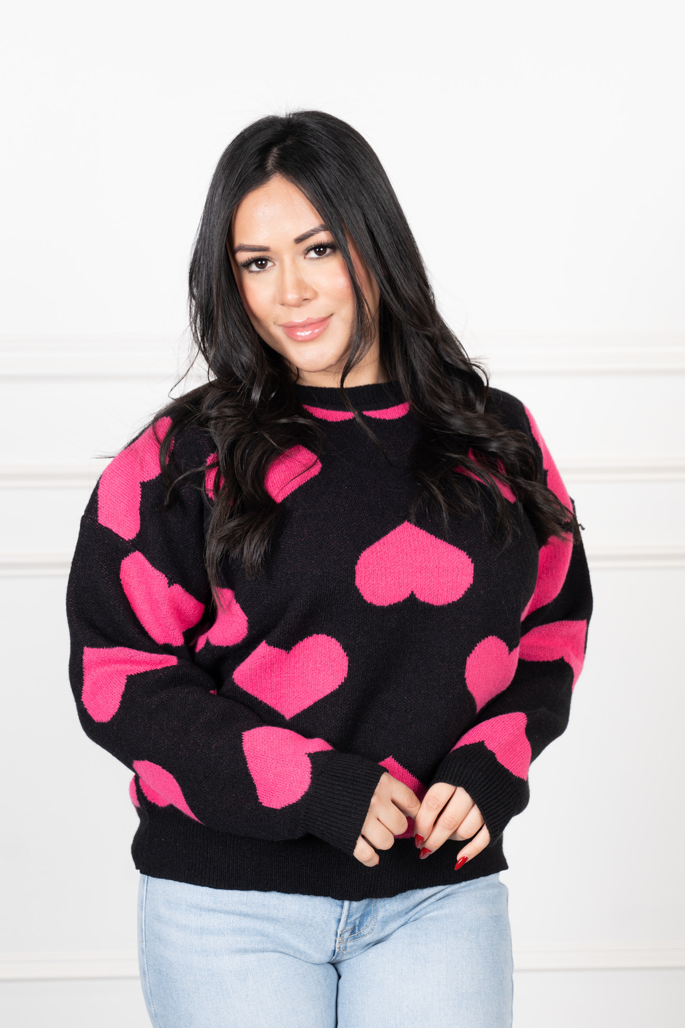 A short sweater that combines love and style. With a print of large hearts all over the garment with a soft and cozy texture and a round neckline, this piece adds a fun touch to your everyday looks. Its shorter torso cut makes it perfect to combine with high-waisted jeans, skirts or layered sets.