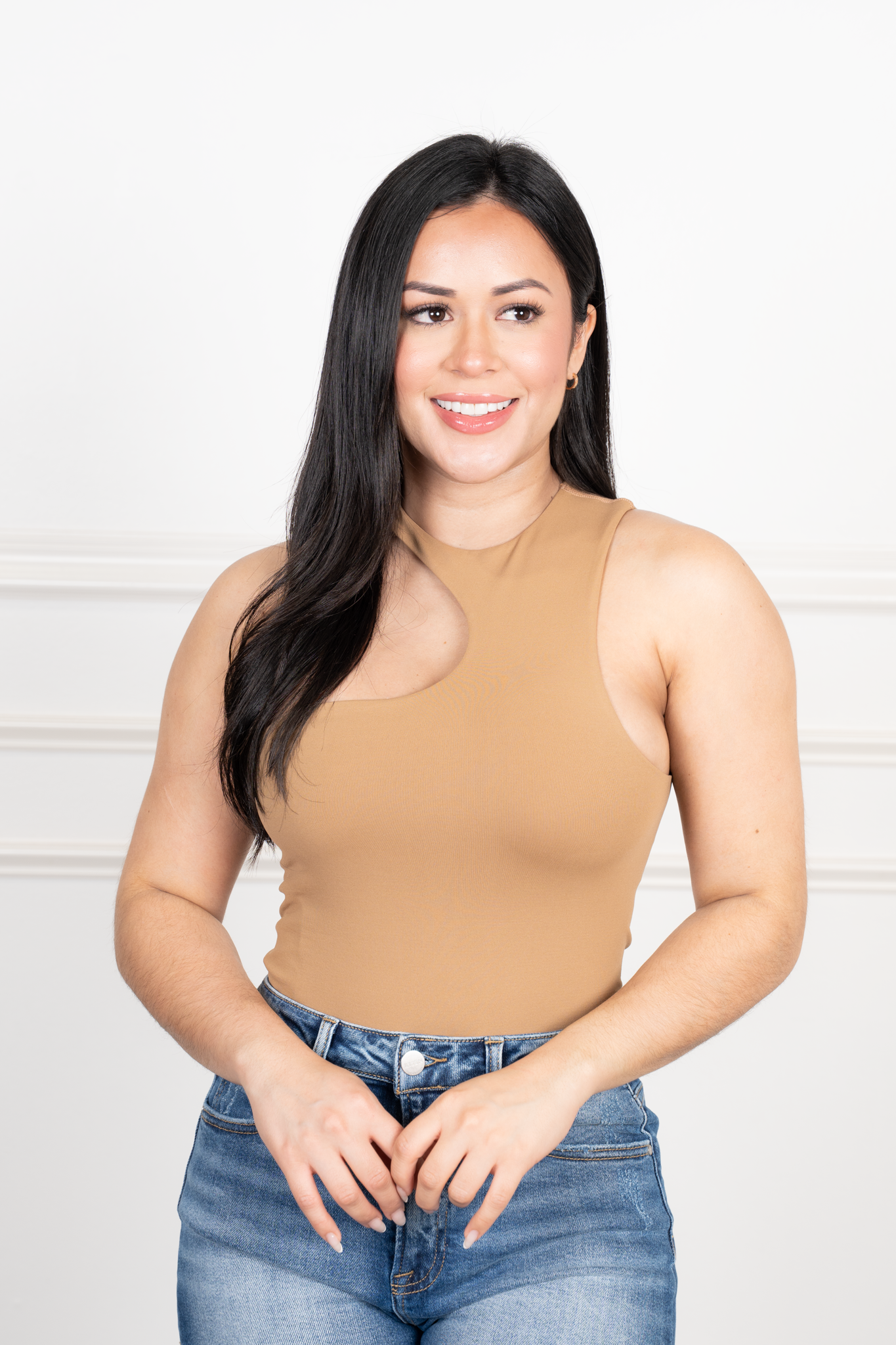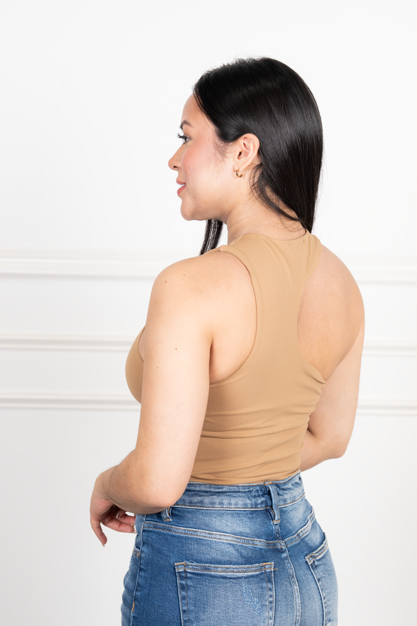 A versatile crop top with a asymmetric neckline and wide one shoulder straps for comfort and coverage. Crafted with double lining and stretchy fabric, it's perfect for layering or wearing solo.