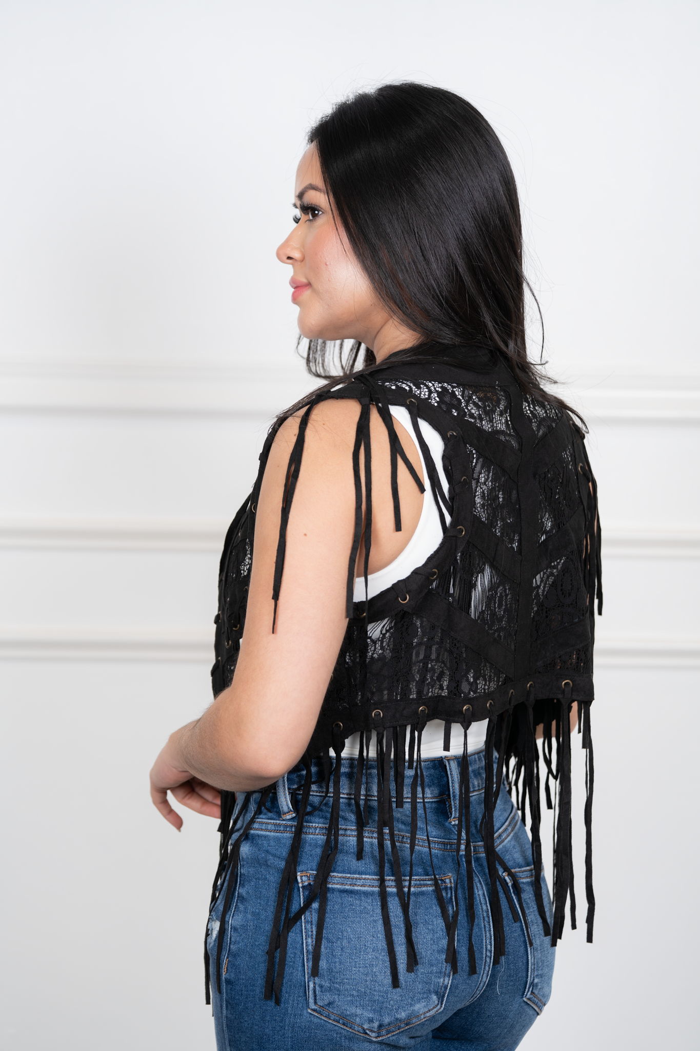 A unique blend of delicate lace embroidery and bold western-inspired details, this short vest is designed for those who love standout fashion. Featuring intricate lace with a crossover eyelet design, this piece is elevated by soft velvet fringe on the shoulders and waist for a striking contrast. Perfect for layering over dresses, tops, or western-chic outfits, this vest adds texture and movement to any look.