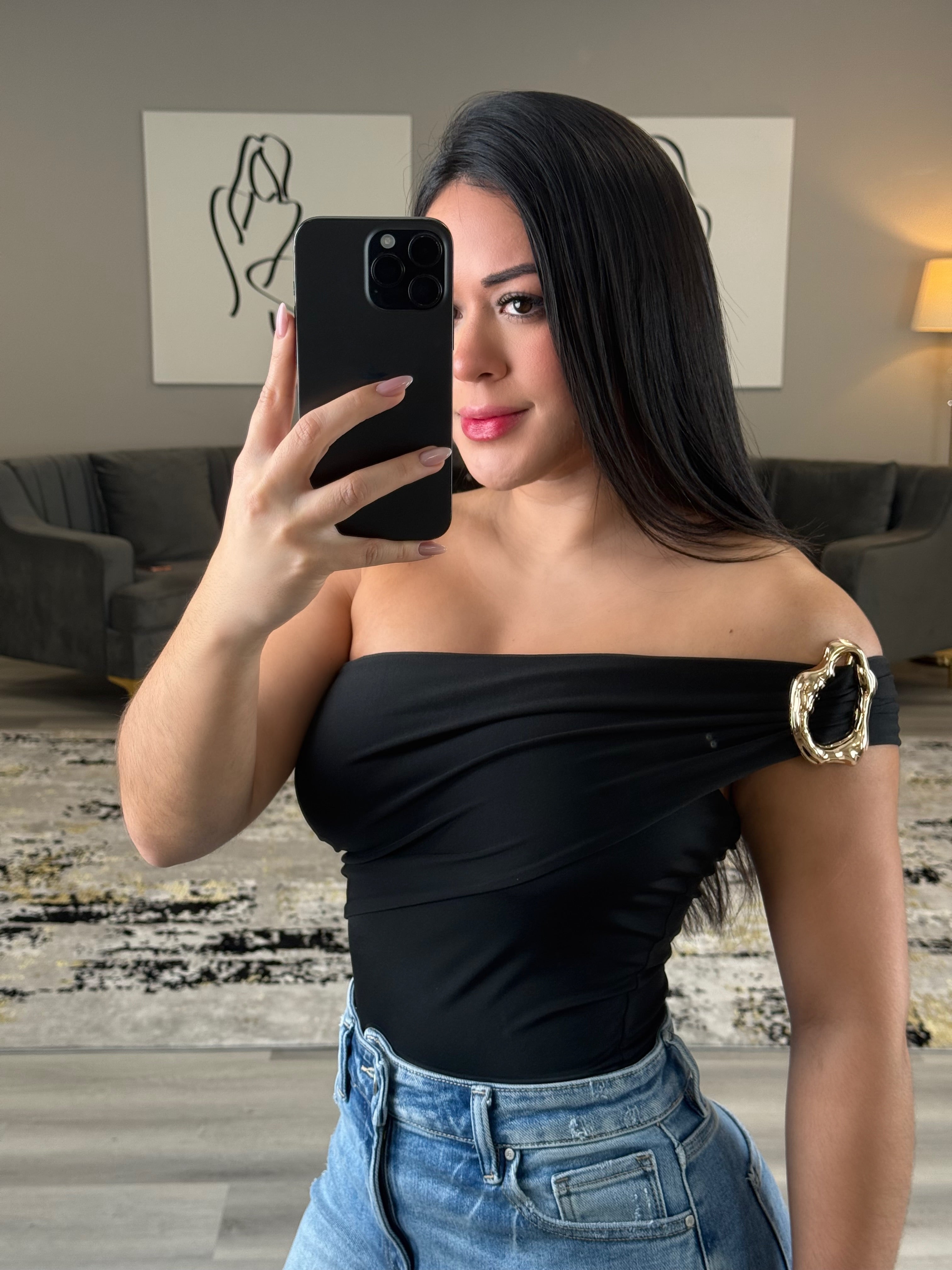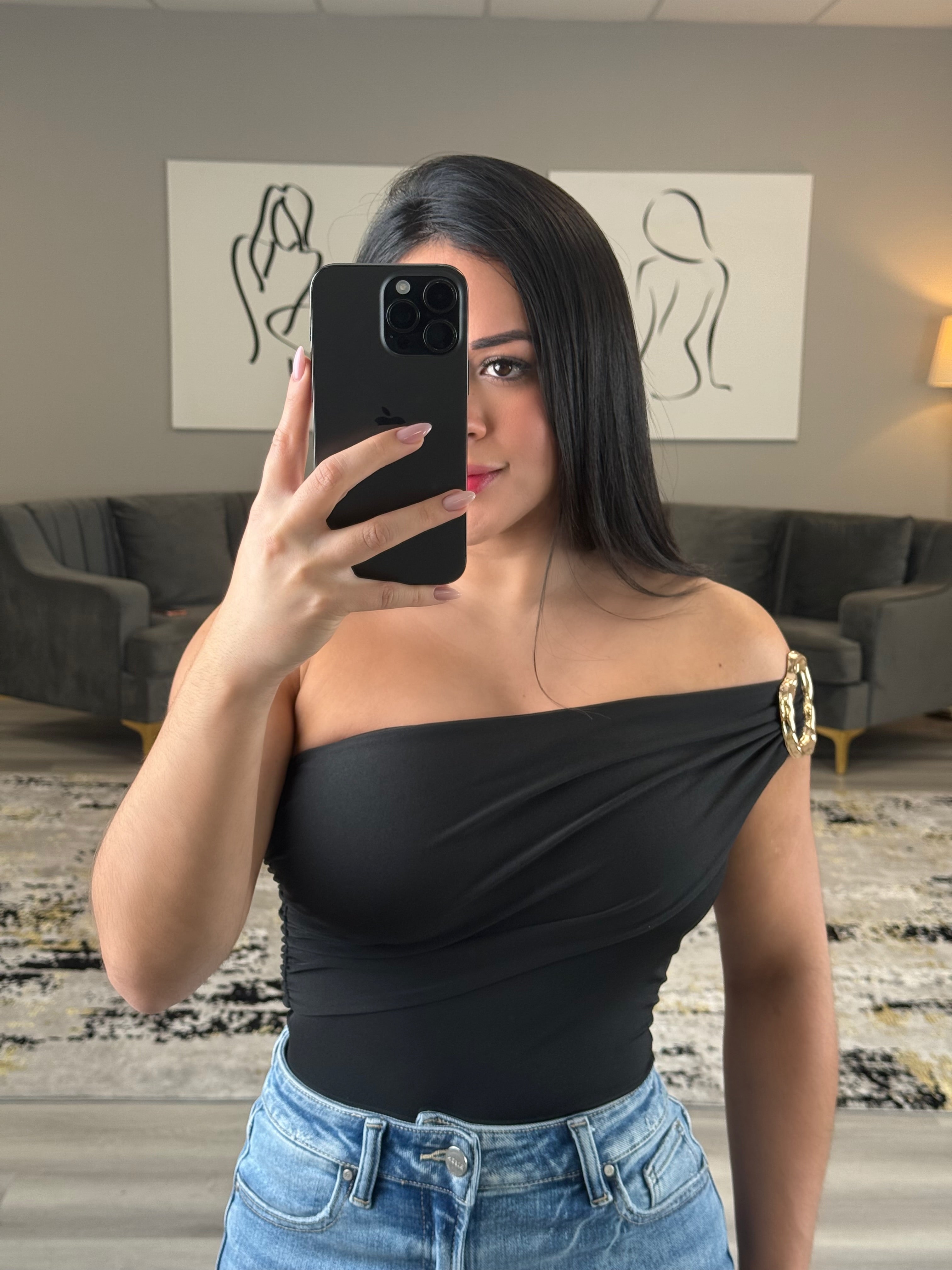 An elegant blouse with an asymmetrical neckline with style side gathered fabric to the shoulder and a silhouette that attracts the body. Handmade in soft elastic fabric, it is a versatile essential for layers or wear only with elegant confidence.