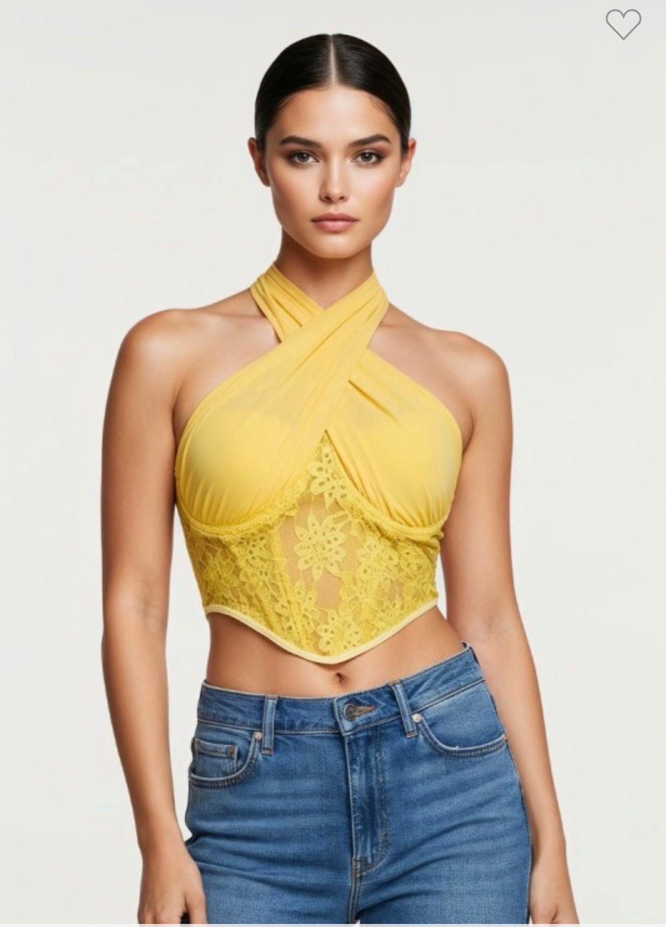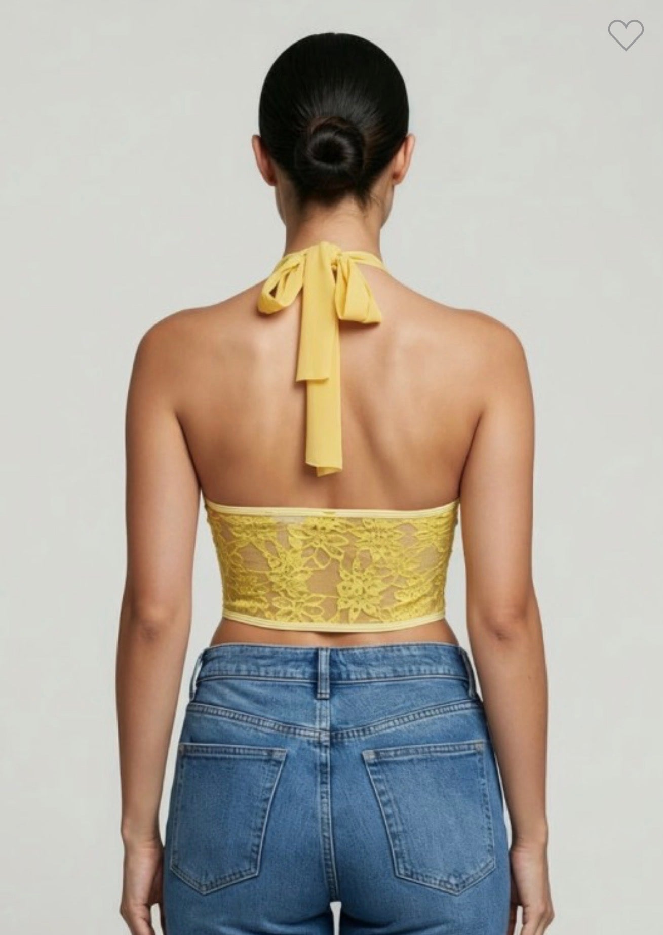 Lia-Yellow Sheer Mesh & Lace Halter Corset Top