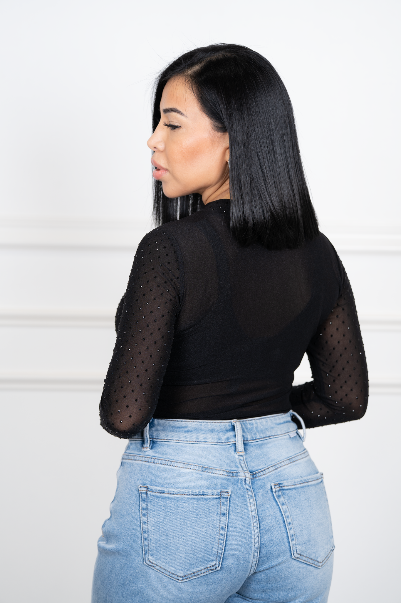 This eye-catching top, adorned with subtle diamond-like sparkles for a touch of glam. The sheer mesh neckline adds a flirty twist, while the stretchy, high-quality fabric ensures a comfortable, true-to-size fit that’s never see-through. Perfect for pairing with skirts or tailored pants for a night out.
