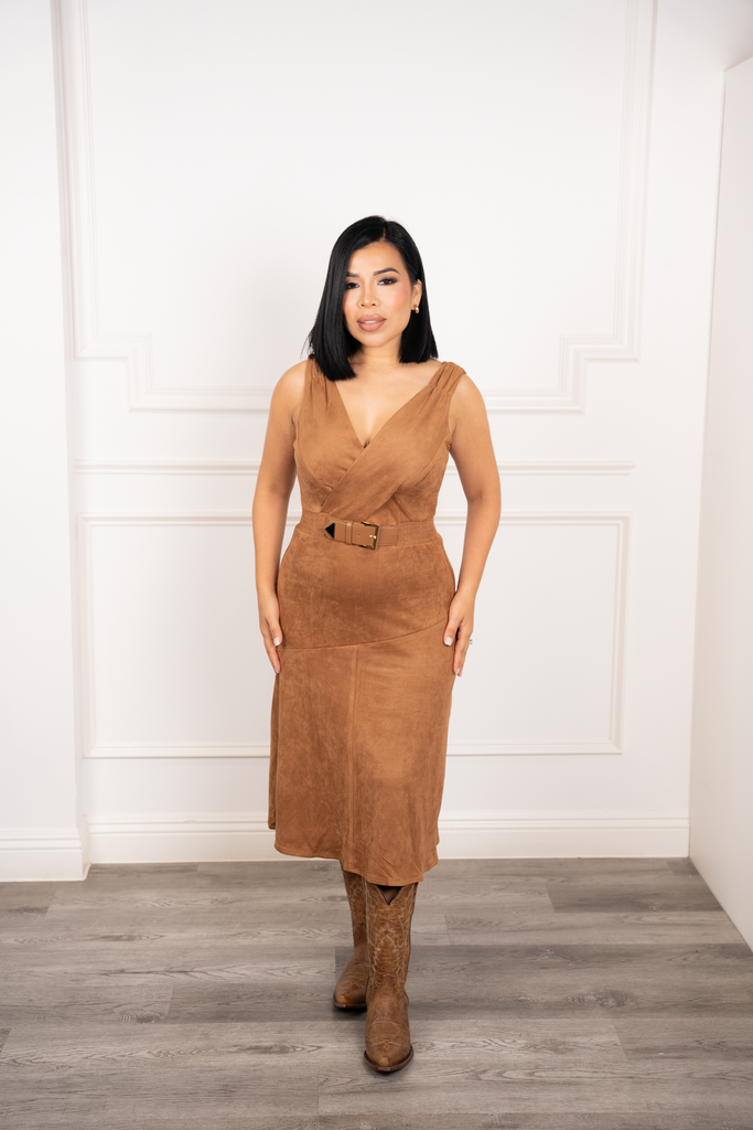 Alessia - Camel Velvet Wrap-Style Midi Dress