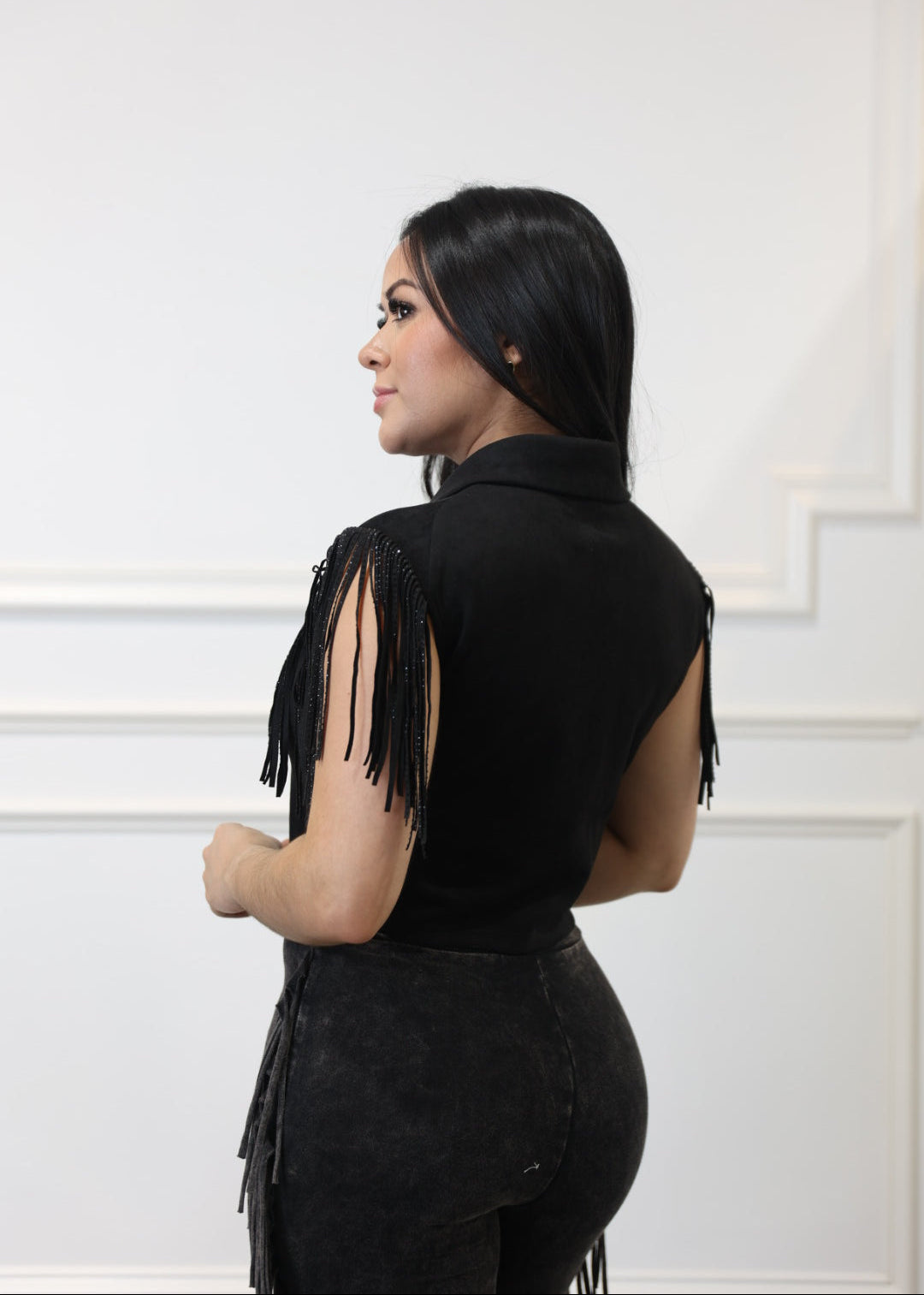 Turn heads in this velvet statement top featuring a polo-style collar, draped sleeves, and shimmering rhinestone-studded fringe along the chest and shoulders. With stretch fabric and front buttons for a comfortable fit, it's the perfect blend of vintage flair and modern sparkle.