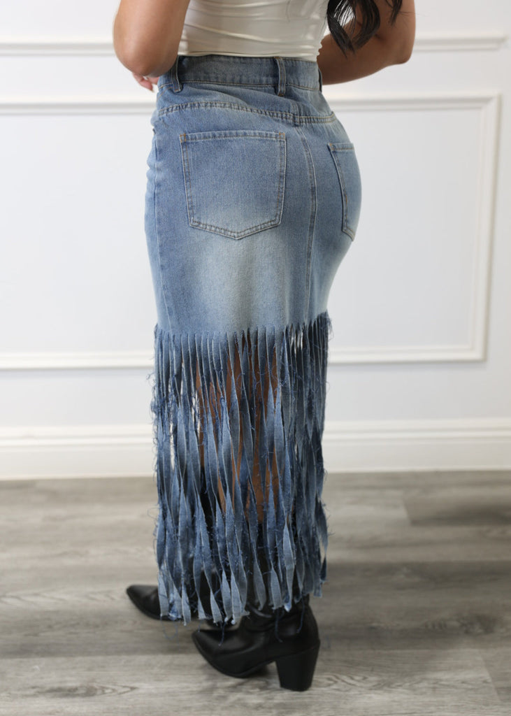 A bold twist on a classic: this non-stretch denim midi skirt features dramatic fringe from the knee down, crafted from the same fabric for a cohesive look. Finished with functional front and back pockets, button closure, and zipper at the waistband for a secure fit.