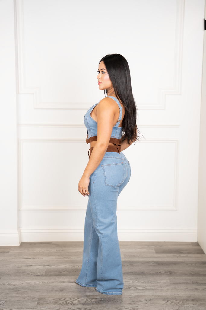 This standout two-piece denim set combines classic and western touches. The adjustable strap top features a flattering V-neckline, front buttons, and suede panels with faux side pockets for a rustic twist. The matching wide-leg pants echo the look with a suede waistband plus functional side and back pockets. Non-stretch denim keeps the fit structured and true to size.