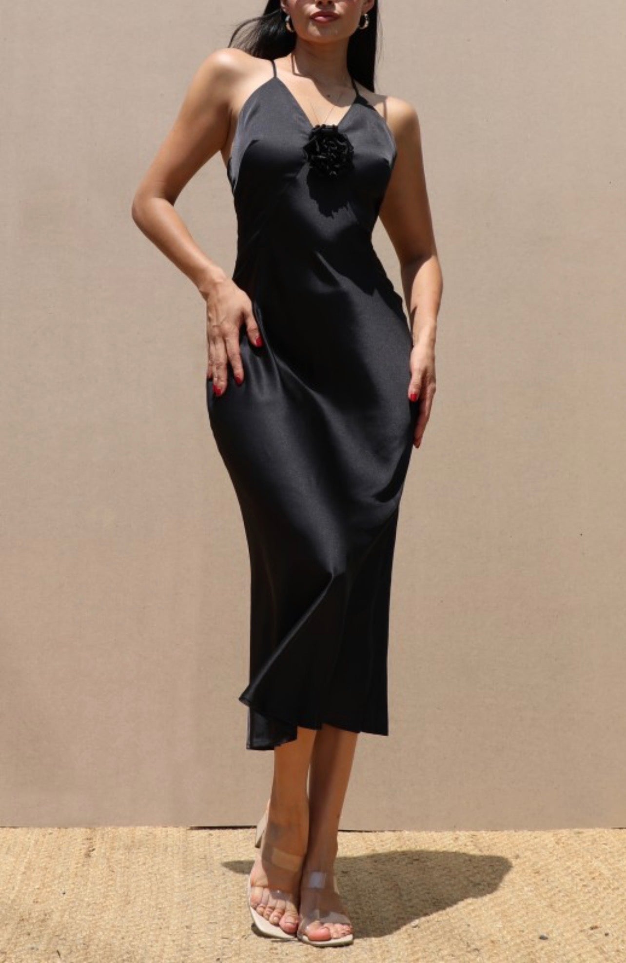 An elegant midi dress with a V-neckline designed with 3D flower with A-cut style detailing the silhouette. Soft elastic satin fabric, zipper on the back with crossed straps is an essential use only with elegant confidence.