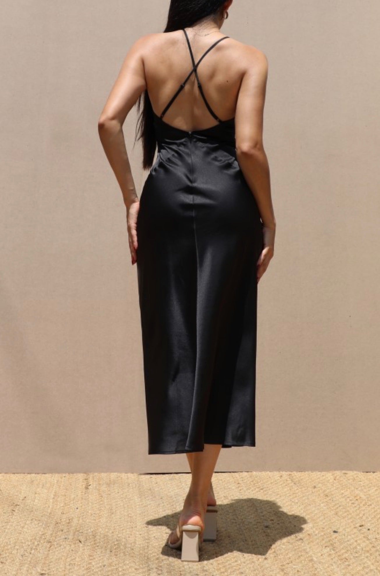 Adri-Black V Neck Satin Midi Dress