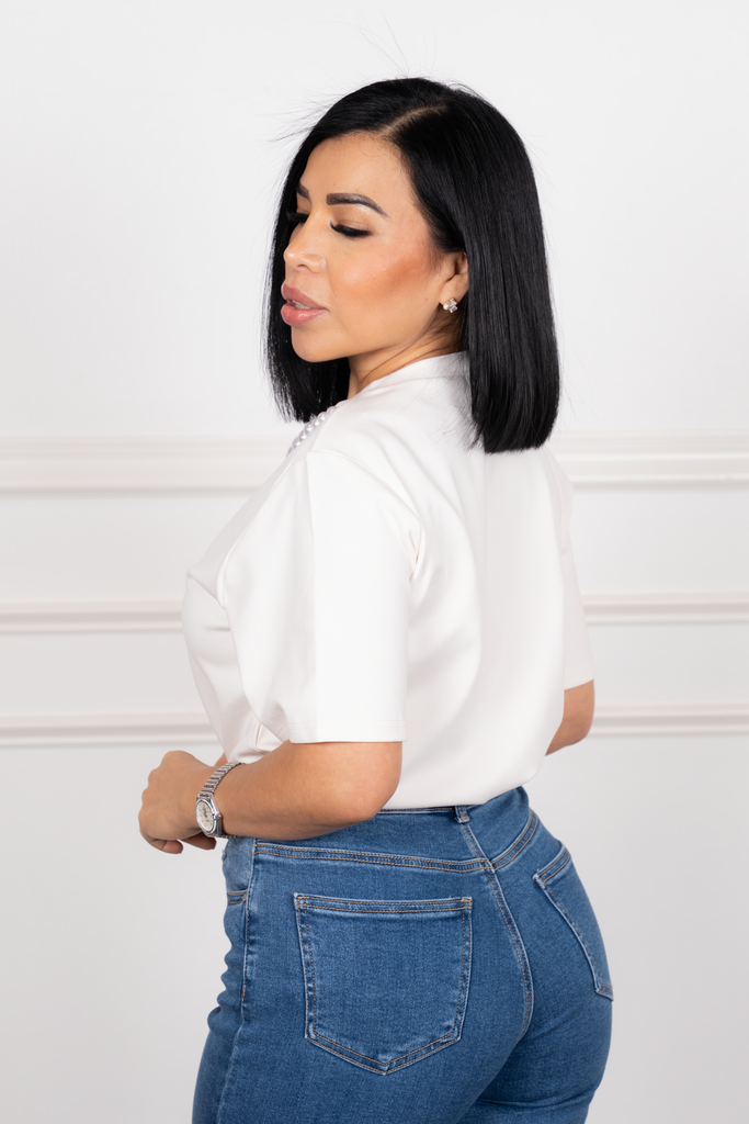 A casual oversized blouse designed with short sleeves and a longer torso for a relaxed silhouette. The neckline is delicately decorated with pearl details, adding a touch of elegance to its urban-inspired style. Crafted from stretch fabric for comfort, this versatile piece is perfect for elevating everyday looks.