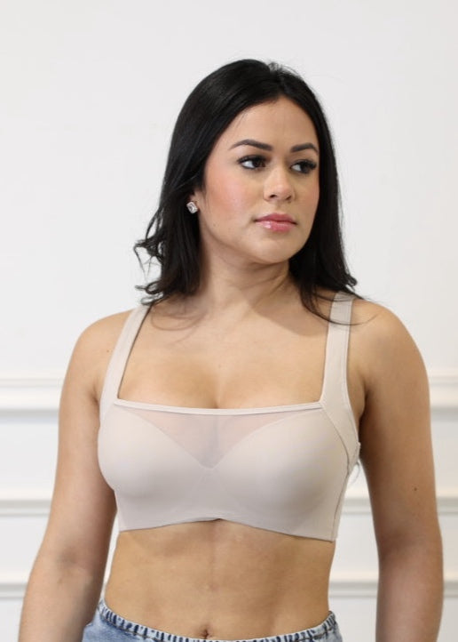 This bra is designed for comfort and confidence, featuring adjustable straps, 4-level back hook closures, and semi-sheer mesh details for discreet wear under deep necklines. The wide side bands smooth out unwanted bulges, and underwire cups provide excellent lift and shape.