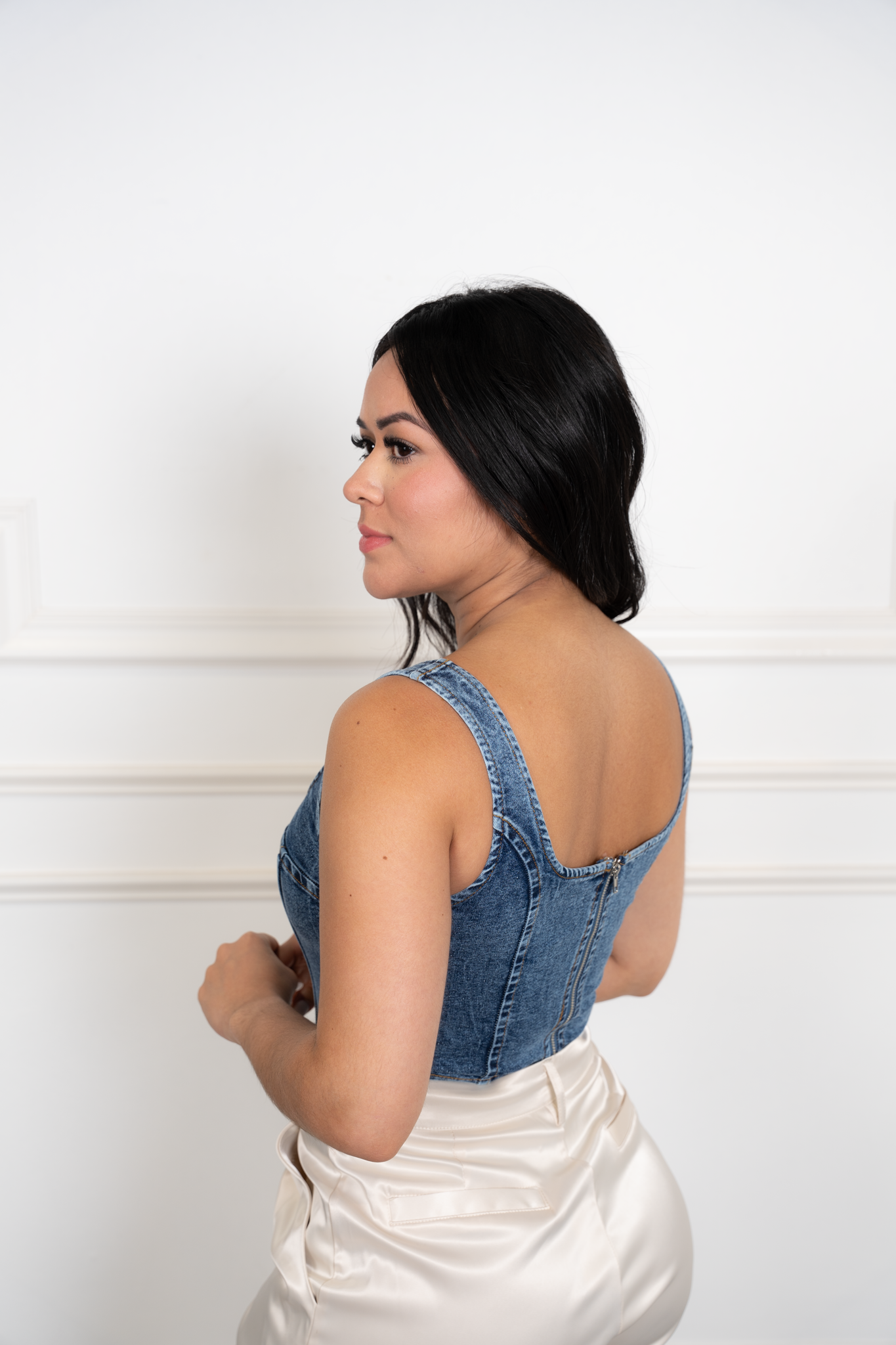 A dark wash denim top with wide straps and a flattering square neckline. Designed in a corset style, it features boning on the front for structure and shaping. Finished with a zipper closure at the back for a snug, secure fit.