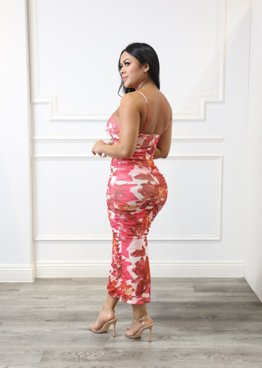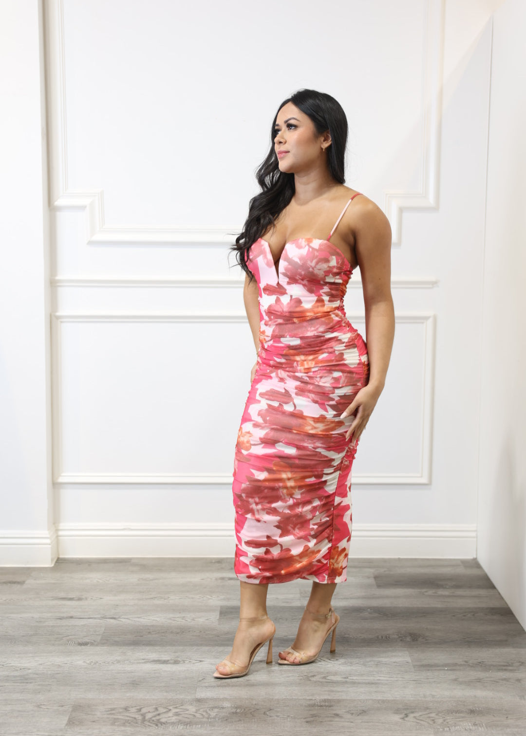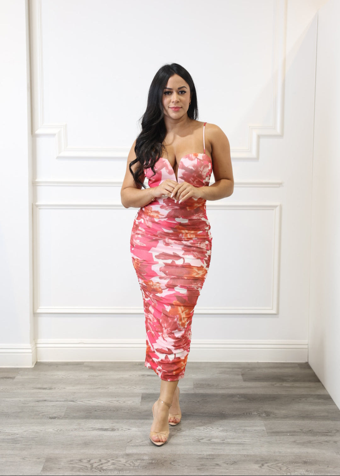 This elegant midi dress features adjustable straps and a sweetheart neckline for a flattering upper silhouette. Ruching along the sides enhances your shape, while a small slit at the back hem adds ease of movement and a subtle allure. The all-over floral print brings a romantic touch, perfect for spring occasions or garden events.