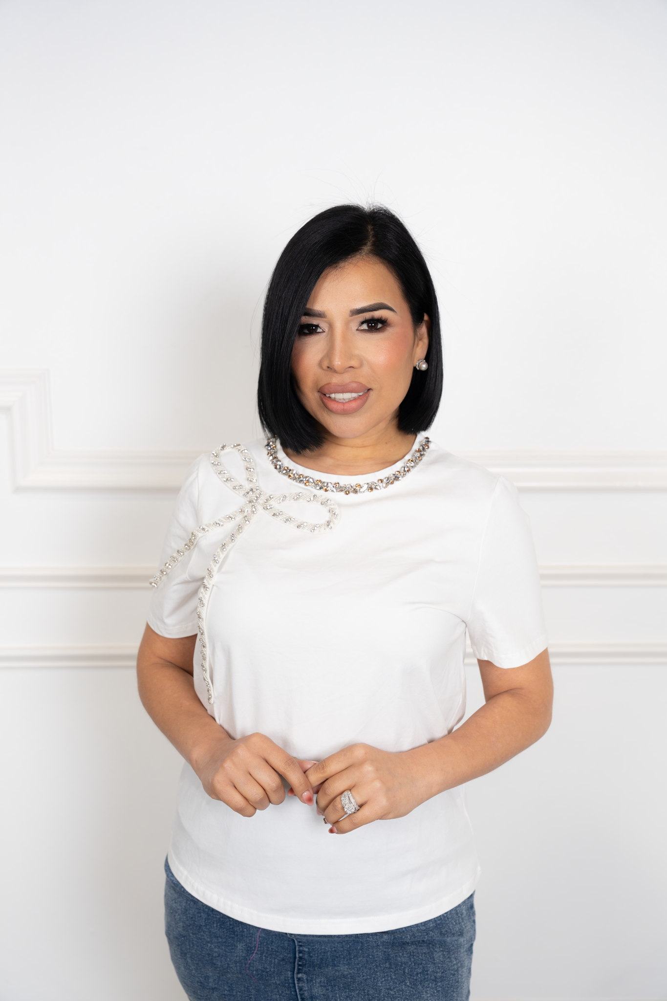 Cristin - Bow & Rhinestone Detail Casual Top