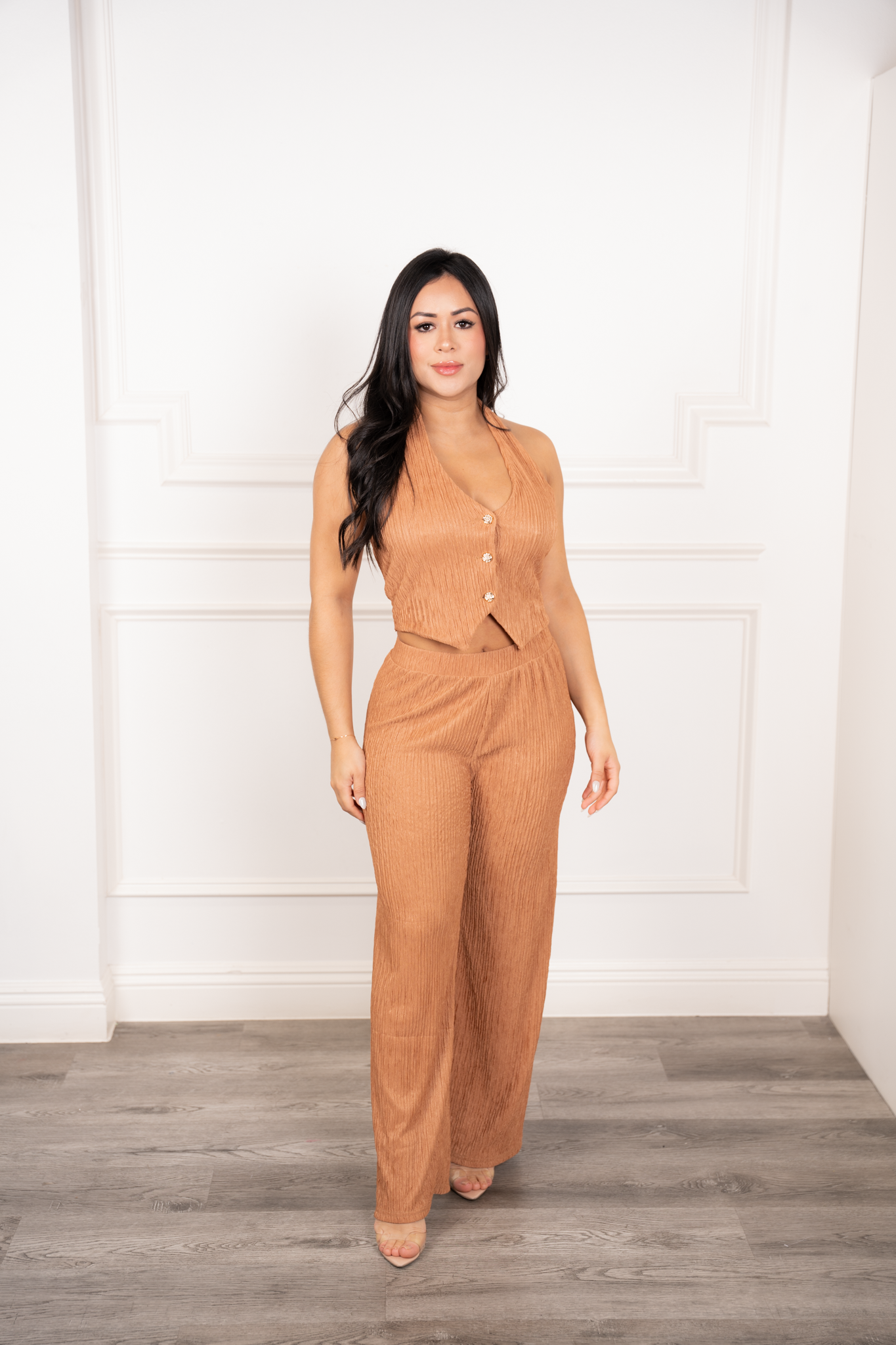 This elegant two-piece set features a halter neck top with front button closure, crafted from soft, textured fabric for a comfortable yet polished look. The matching pants come with an elastic waistband for a perfect fit, making this set ideal for both casual and dressed-up occasions.
