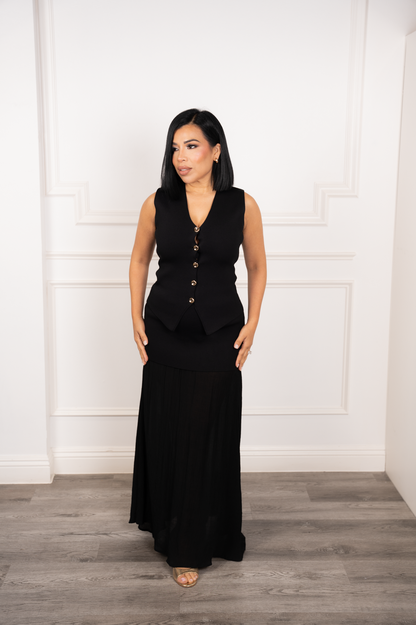 Esmeralda - Black Textured Blazer Top & Pleated Midi Skirt Set