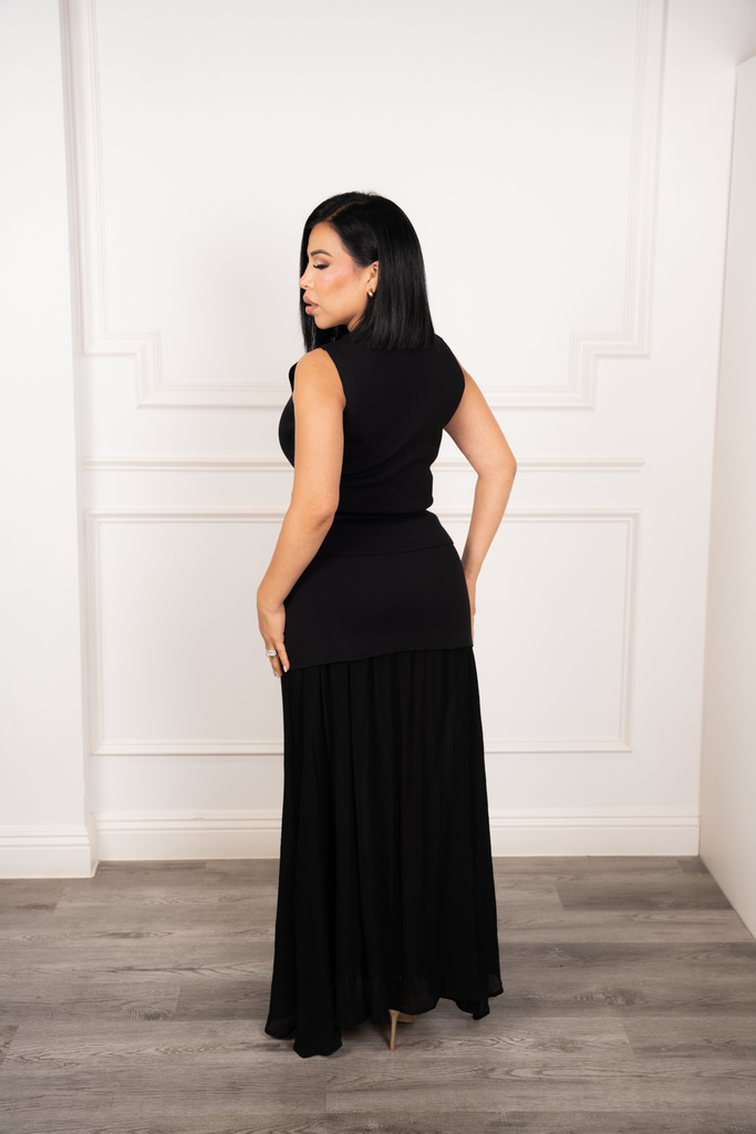 Skirt: Midi skirt designed to complement the top, featuring a structured waistband in matching fabric and a semi-sheer pleated underlayer that adds flow and sophistication. Finished with a hidden back zipper for a seamless fit.
