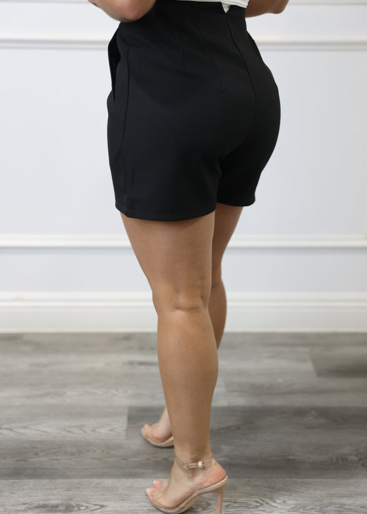 These high-waisted tailored shorts feature a wide-leg silhouette for a polished yet comfortable fit. Designed with side pockets and a secure waistband with zipper and hook closure, they offer a refined look perfect for both office wear and chic casual outfits. Made from premium non-stretch fabric for structure and elegance.