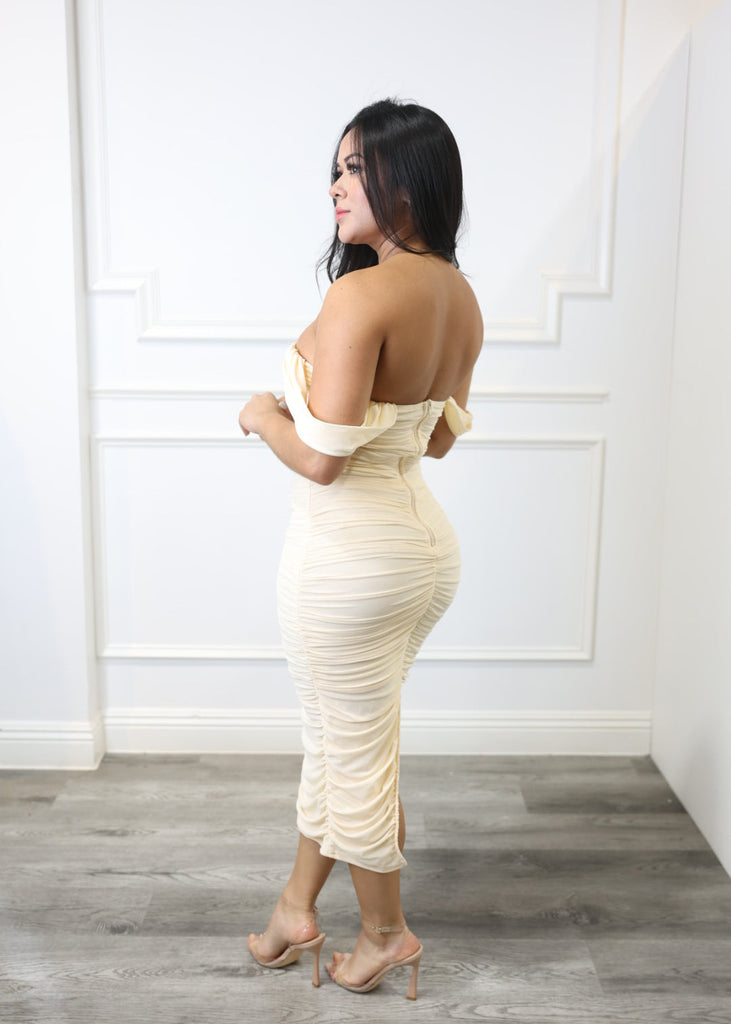 Noelle – Beige Off-Shoulder Ruched Midi Dress