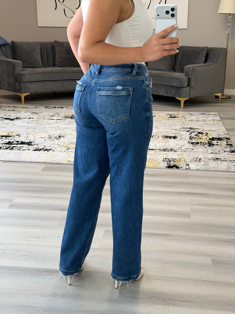 These wide-leg baggy jeans feature subtle distressed details and frayed hems at the ankles for a casual, worn-in vibe. Designed with both side and back pockets, they offer a classic fit with a modern edge. Crafted from stretchy, high-quality denim, they provide comfort, style, and a flattering silhouette for everyday wear.