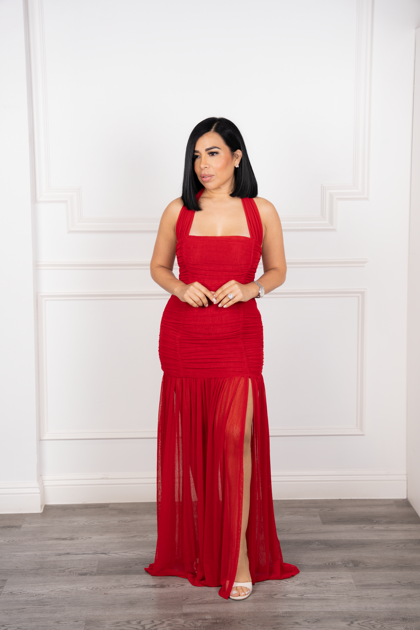 This figure-flattering gown features a halter neckline with adjustable ties, a ruched bodice, and sheer lower paneling that flows into a soft mermaid silhouette. Designed with a high left slit and stretch fabric, it hugs in all the right places. The elastic waistband adds comfort, while the back zipper ensures a smooth finish.