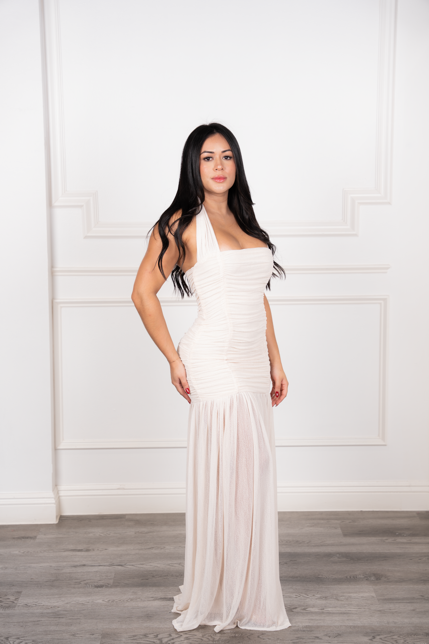 This figure-flattering gown features a halter neckline with adjustable ties, a ruched bodice, and sheer lower paneling that flows into a soft mermaid silhouette. Designed with a high left slit and stretch fabric, it hugs in all the right places. The elastic waistband adds comfort, while the back zipper ensures a smooth finish.